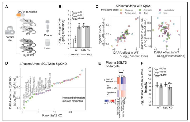 在SGLT2 KO和WT小鼠中,許多代謝物的比率發(fā)生了類似的變化,就像在WT小鼠中使用達格列凈和溶劑處理一樣(圖5C左圖),這表明SGLT2抑制的后果。在其他方面,葡萄糖比率的下降,反映了尿糖排泄的增加。正如預(yù)期的那樣,SGLT2的缺失阻斷了達格列凈對葡萄糖排泄的影響(圖5C右圖)。另一方面,達格列凈顯著改變了SGLT2 KO小鼠體內(nèi)許多代謝物的比例,表明了一種偏離靶點的效應(yīng)(圖5D)。血漿:尿液比例的排名變化顯示,達格列凈降低了SGLT2 KO小鼠中多種芳香酸代謝物的比例,包括甲酚和馬尿酸鹽,其次是色氨酸代謝物。血漿水平分析確定了SGLT2i在SGLT2 KO環(huán)境中顯著改變的5種代謝物,包括PCL硫酸鹽和一種修飾的馬尿酸(圖5E和5F)。該實驗表明SGLT2i治療具有非靶點效應(yīng),包括對甲酚、馬尿酸鹽和色氨酸代謝物。