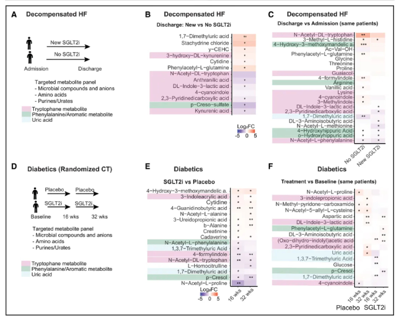 鑒于腎臟SGLT2相互作用組以及微生物對SGLT2i的反應(yīng)在小鼠和人類中相似,我們想知道SGLT2i是否會影響循環(huán)中的溶質(zhì),在縱向數(shù)據(jù)中與心血管相關(guān)。對來自2個獨立研究的患者的血漿樣本進行了靶向代謝組分析,目標是80個有機陰離子和尿毒癥毒素。在第一組>40名患者中,在失代償性心衰的真實環(huán)境中分析了這種影響(圖6A)。結(jié)果表明,SGLT2i顯著降低或鈍化了心力衰竭患者血漿中幾種有機陰離子的增加,但僅當住院期間添加SGLT2i時(圖6B和6C)。包括幾種色氨酸代謝物,如ILA、犬尿酸和乙酰色氨酸,以及苯丙氨酸代謝物苯乙酰谷氨酰胺和PCL硫酸鹽。分析了在糖尿病患者中使用SGLT2I(依帕列凈)的隨機對照試驗的縱向數(shù)據(jù)(圖6D)。與基線和安慰劑相比,二甲基尿酸和三甲基尿酸的血漿濃度降低,PCL降低,吲哚代謝物增加緩慢(圖6E和6F)。在兩項臨床研究中,降低的溶質(zhì)大部分來自嘌呤代謝和腸道芳香氨基酸代謝,這與在小鼠身上觀察到的代謝器官一致。