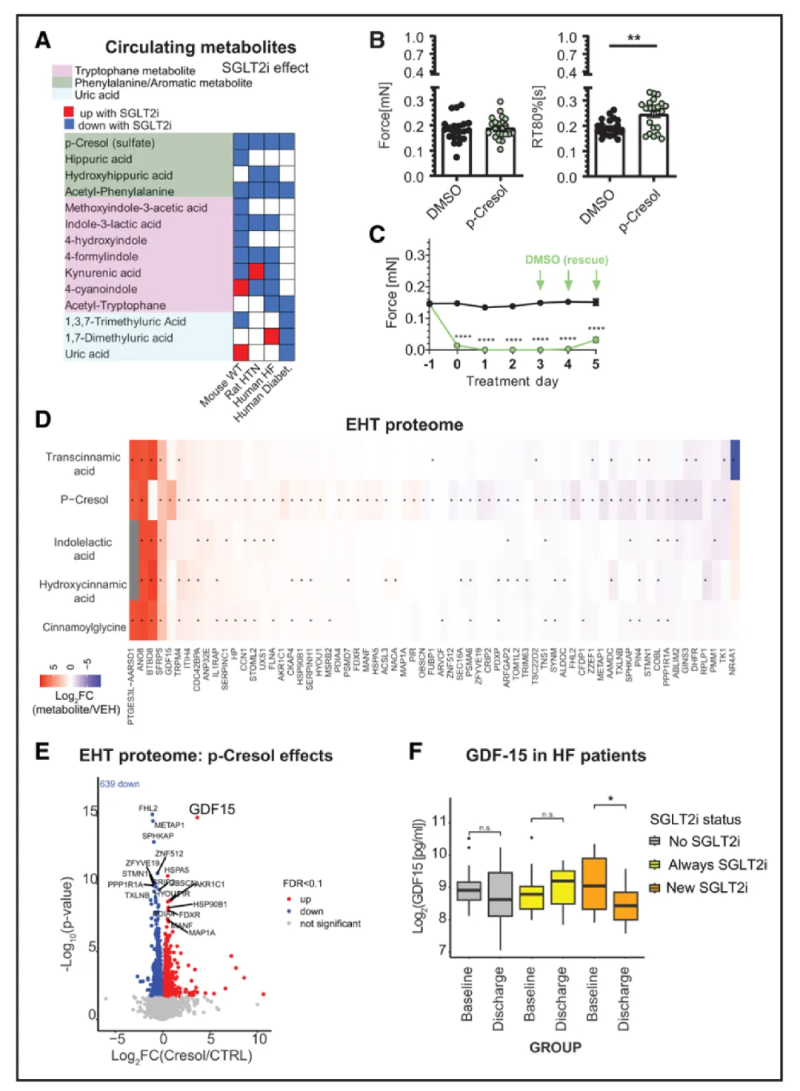 為了進一步闡明該機制,對用300μM PCL、吲哚乳酸和3種其他芳香族代謝物處理的 EHT 組織進行了蛋白質(zhì)組學分析(圖7D)。觀察到最強烈的變化是 PCL 的反應(yīng)(圖7D)。多種蛋白質(zhì)的增加包括心臟病相關(guān)通道TRPM4、 FLNA和生長因子CCN1;減少的蛋白質(zhì)包括 PPP1R1A,其下調(diào)已被報道為人類HF的標志。PCL改變的蛋白質(zhì)組的一個獨特特征是心臟肌節(jié)相關(guān)蛋白的減少(圖S7D),以及應(yīng)激信號 GDF15的強烈感應(yīng)(圖7E)。考慮到HF患者中該通路的調(diào)節(jié),檢測了GDF15 水平,發(fā)現(xiàn)接受SGLT2i治療心力衰竭的患者循環(huán) GDF15 減少(圖7F)。
