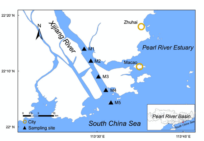 - 從M1到M5的采樣點鹽度升高,每對采樣點之間有顯著差異(P < 0.05);