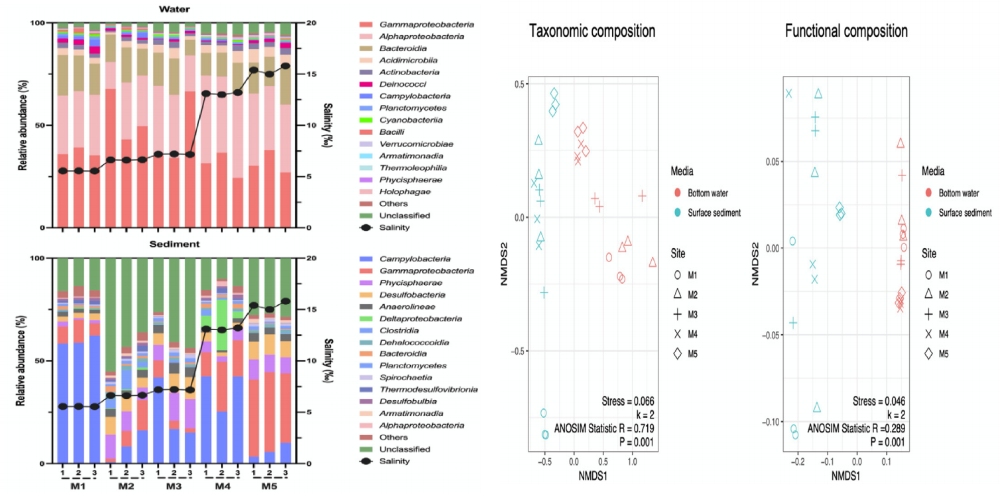 - 由于SWI對沉積細菌群落有主要影響,對M1(低鹽度)和M5(高鹽度)進行了宏基因組測序。通過NMDS分析,沉積物細菌群落的病灶組成清晰分離;