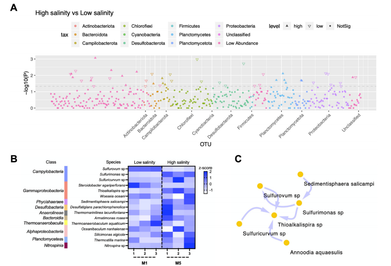 - 除低豐度細菌類群和未分類類群外,OTUs在低鹽度下富集的細菌門,包括放線菌門、氯化菌門、脫硫菌門、厚壁菌門和變形菌門,而高鹽度的群落包括彎曲菌和普朗菌;