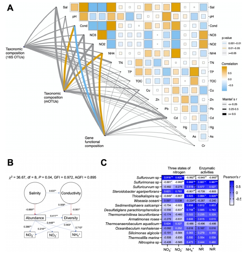 - Pearson相關分析顯示,優(yōu)勢細菌分類群Sulfurovum sp.和sulphimonas sp.與氮形態(tài)(NO2?、NO3?和NH4+)和酶活性(NR和NiR)顯著相關(P < 0.05);