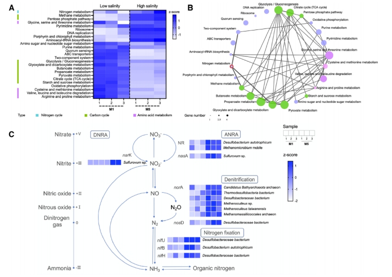 - 功能基因通過KEGG途徑富集的結果表明,氮代謝相關功能基因在高鹽環(huán)境下的表達水平高于低鹽環(huán)境,而碳和氨基酸代謝相關功能基因在低鹽環(huán)境下的表達水平高于高鹽環(huán)境。這表明SWI通過建立鹽度梯度刺激氮循環(huán);