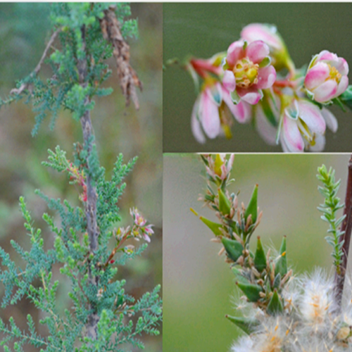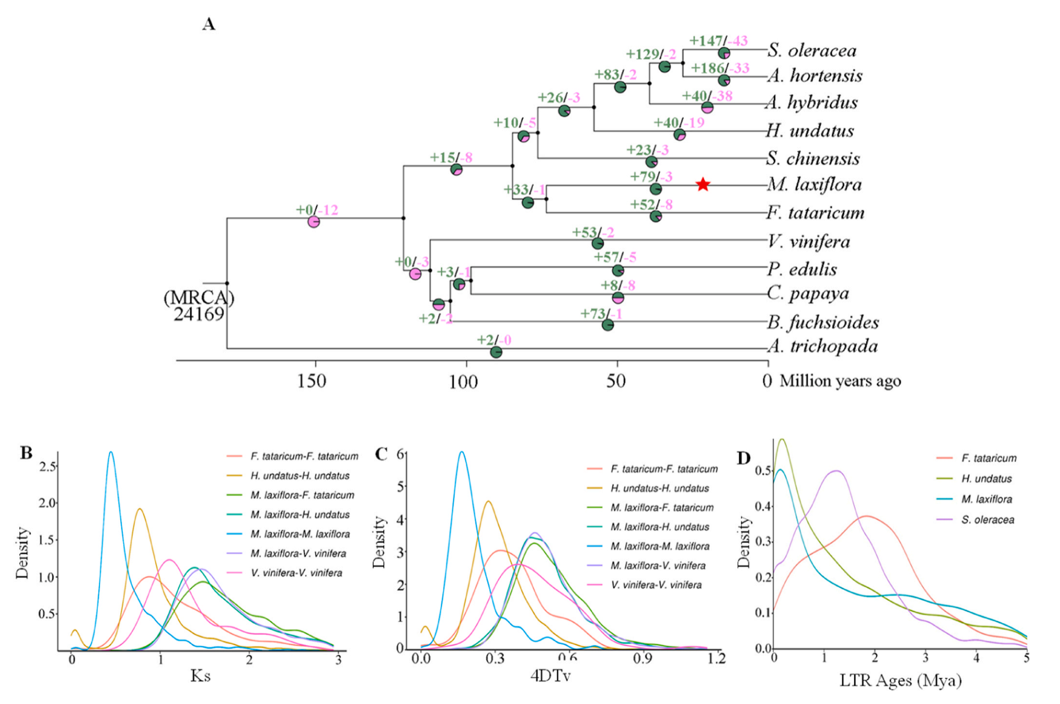 比較基因組研究發(fā)現(xiàn)疏花水柏枝與苦蕎(F. tataricum)的親緣關(guān)系最為密切,大約在65-81百萬年前(Mya)發(fā)生分化;在19.74 ~ 24.60 Mya之間發(fā)生了一次全基因組復(fù)制(WGD), 4dTV分析證實了這一點。在0.15 Mya左右存在一個長末端重復(fù)(LTR)插入。這些基因組變化可能與疏花水柏枝在進(jìn)化過程中所經(jīng)歷的環(huán)境劇變(如青藏高原隆升)有關(guān)?;蚣易宸治鲲@示疏花水柏枝的特有基因家族與能量代謝和信號轉(zhuǎn)導(dǎo)密切相關(guān);85個基因在疏花水柏枝基因組中經(jīng)歷了正選擇,這些基因在與氨基酸合成和代謝相關(guān)的KEGG通路中顯著富集。