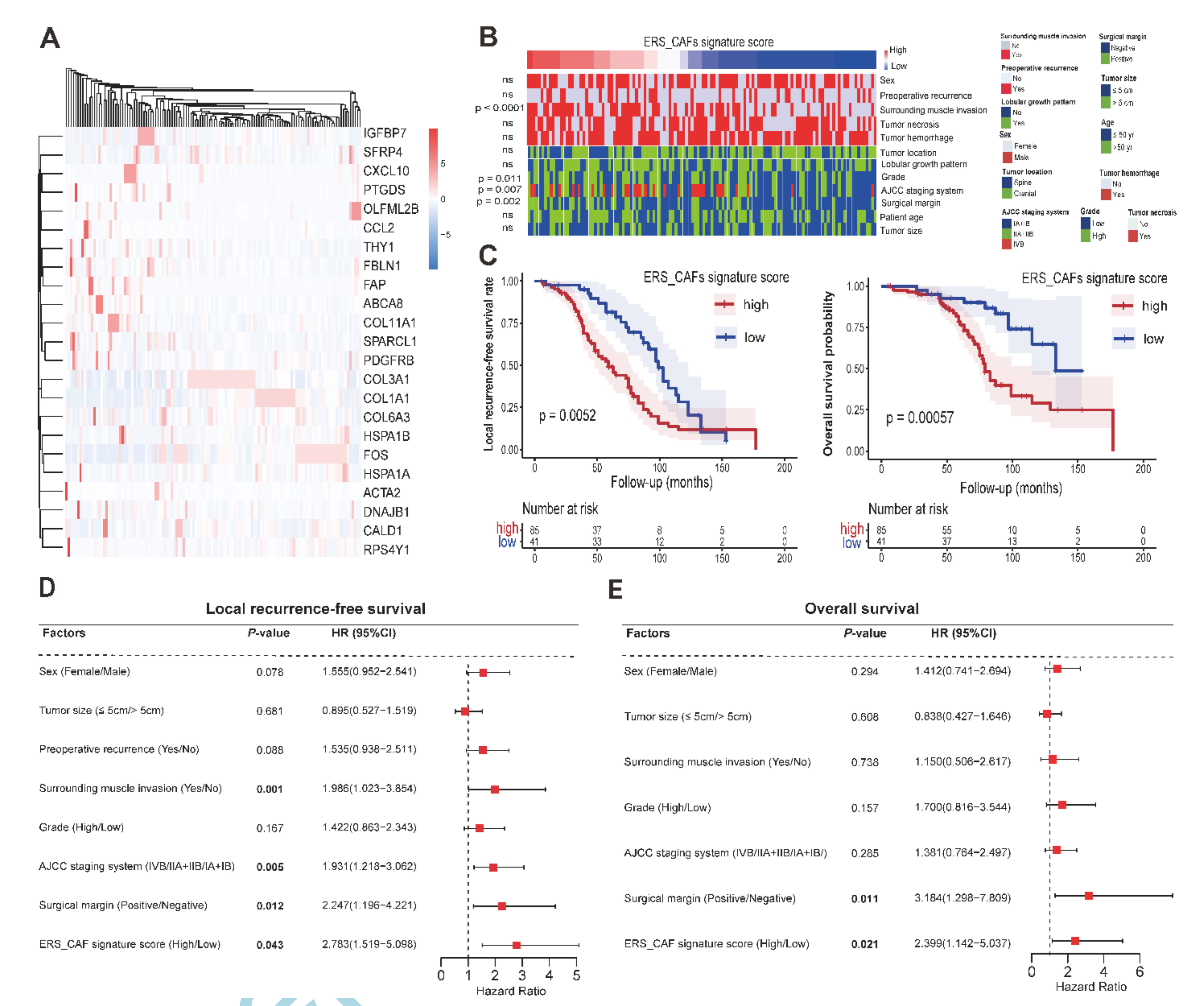 為了驗證 ERS-CAF 的促腫瘤作用,該研究對來自脊索瘤患者的 126 個樣本進行了總 RNA 測序(圖 4A)。使用代表該 CAF 子集的基因集計算每位患者的 ERS-CAF 特征評分,其中包括 ERS 相關(guān)基因(例如 HSPA1A、HSPA1B、CCL2 和 DNAJB1)和 CAF 特定標記(例如 THY1、FAP、?和 COL1A1)。ERS-CAF 特征評分與臨床數(shù)據(jù)之間的關(guān)系如圖 4B 所示。如上所示,ERS-CAF特征評分與腫瘤侵犯周圍肌肉(P?<?0.0001)、腫瘤分級(P?=?0.011)、AJCC分期(P?=?0.011)顯著相關(guān)。P?=?0.007)和手術(shù)切緣(P?=?0.002)。與原發(fā)腫瘤患者相比,復發(fā)腫瘤患者的 ERS-CAF 特征較高(-0.06?±?0.53 vs. -0.10?±?0.51),但這種差異并不具有統(tǒng)計學意義(t?=?-0.404)?,p?=?0.687)。對于生存分析,作者使用在線平臺確定ERS-CAF特征評分的閾值,并根據(jù)截止點將患者分為高(>截止)和低(≤截止)亞組。Kaplan-Meier 分析表明,ERS-CAF 特征評分的增加可預測不利的 LRFS 和 OS(圖 4C),在控制 Cox 多元回歸模型中的重要臨床因素后,這一結(jié)果仍然顯著(圖4D–E)。這些數(shù)據(jù)表明使用 GSVA 特征來反映脊索瘤組織中的 ERS-CAF 亞群的可靠性,并強調(diào)了 ERS-CAF 在調(diào)節(jié)腫瘤進展中的重要性。