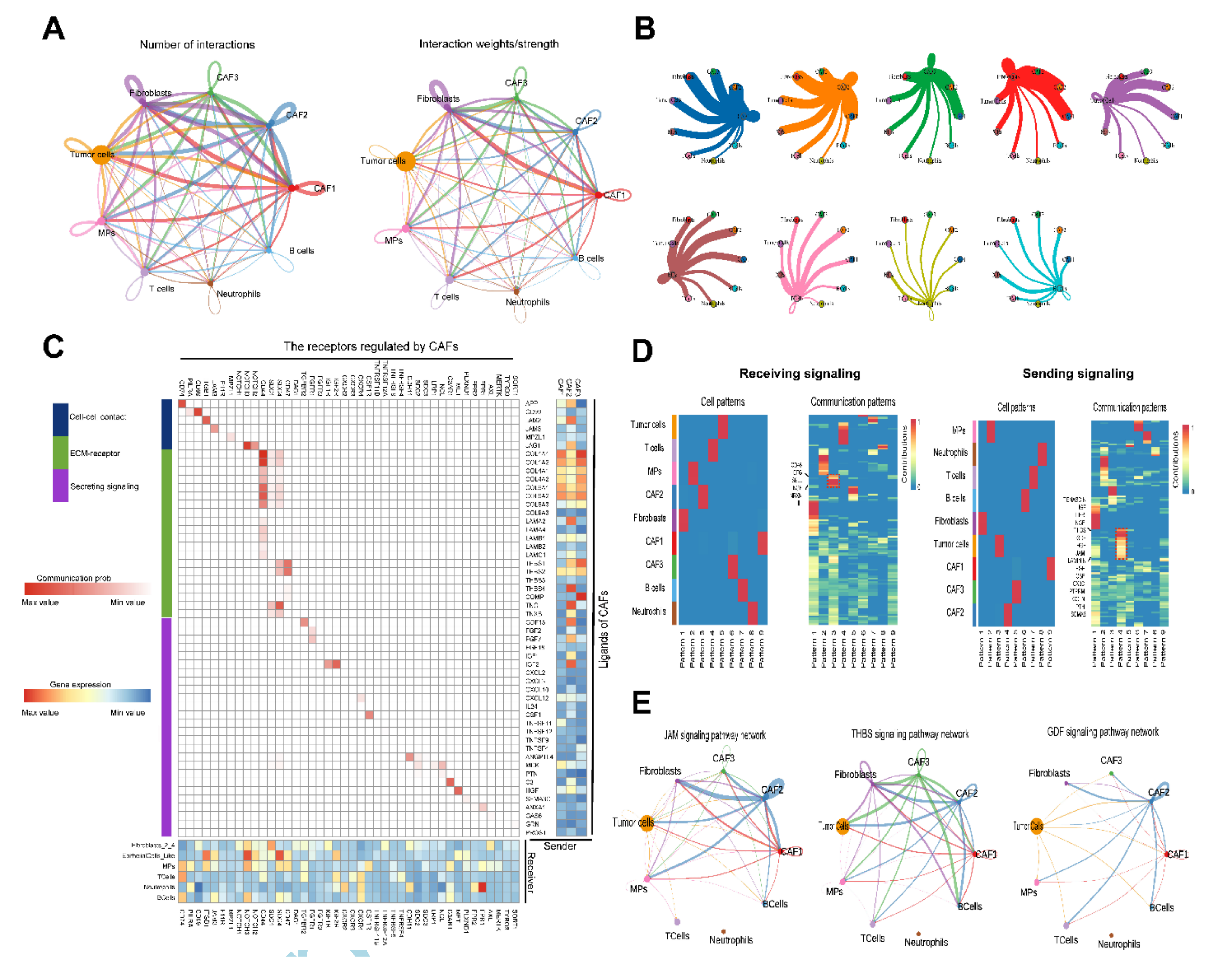 為了推斷ERS-CAF亞群促進腫瘤進展的可能機制,該研究使用CellChatDB數(shù)據(jù)庫來剖析CAF亞群與其他細胞類型之間的細胞間通訊。結(jié)果表明,CAF 亞群(尤其是 ERS-CAF 和 CAF 簇 1)顯著激活并與多種細胞相互作用(圖 5A 和 B)。鑒定出許多配體-受體對,以證明 ERS-CAF 與脊索瘤中主要細胞類型之間廣泛的分子相互作用。對于傳入信號,ERS-CAF 主要接受來自 CD46、EFG、SELL、NGF、NRXN 和 HH 分子的信號(圖 5D)。在發(fā)送信令方面,ERS-CAF 主要產(chǎn)生 TENASCIN、IGF、LIFR、NGF、THBS、GDF 和 JAM 信號(圖 5D)。此外,ERS-CAF 被證明是多個細胞通訊網(wǎng)絡中的核心細胞,包括 JAM、THBS 和 GDF 信號通路(圖 5E),所有這些都已被證明在細胞通訊網(wǎng)絡中發(fā)揮著重要作用。此外,該研究對 10 個腫瘤組織樣本進行了 QIF 檢測,以進一步證實 ERS-CAF 與腫瘤細胞之間 JAM2 和 JAM3 的相互作用信號傳導。研究發(fā)現(xiàn),JAM2/JAM3 信號在腫瘤細胞靠近 ERS-CAF 的區(qū)域表達更多。綜上所述,這些數(shù)據(jù)表明 ERS-CAF 可以通過各種分子機制促進脊索瘤進展。