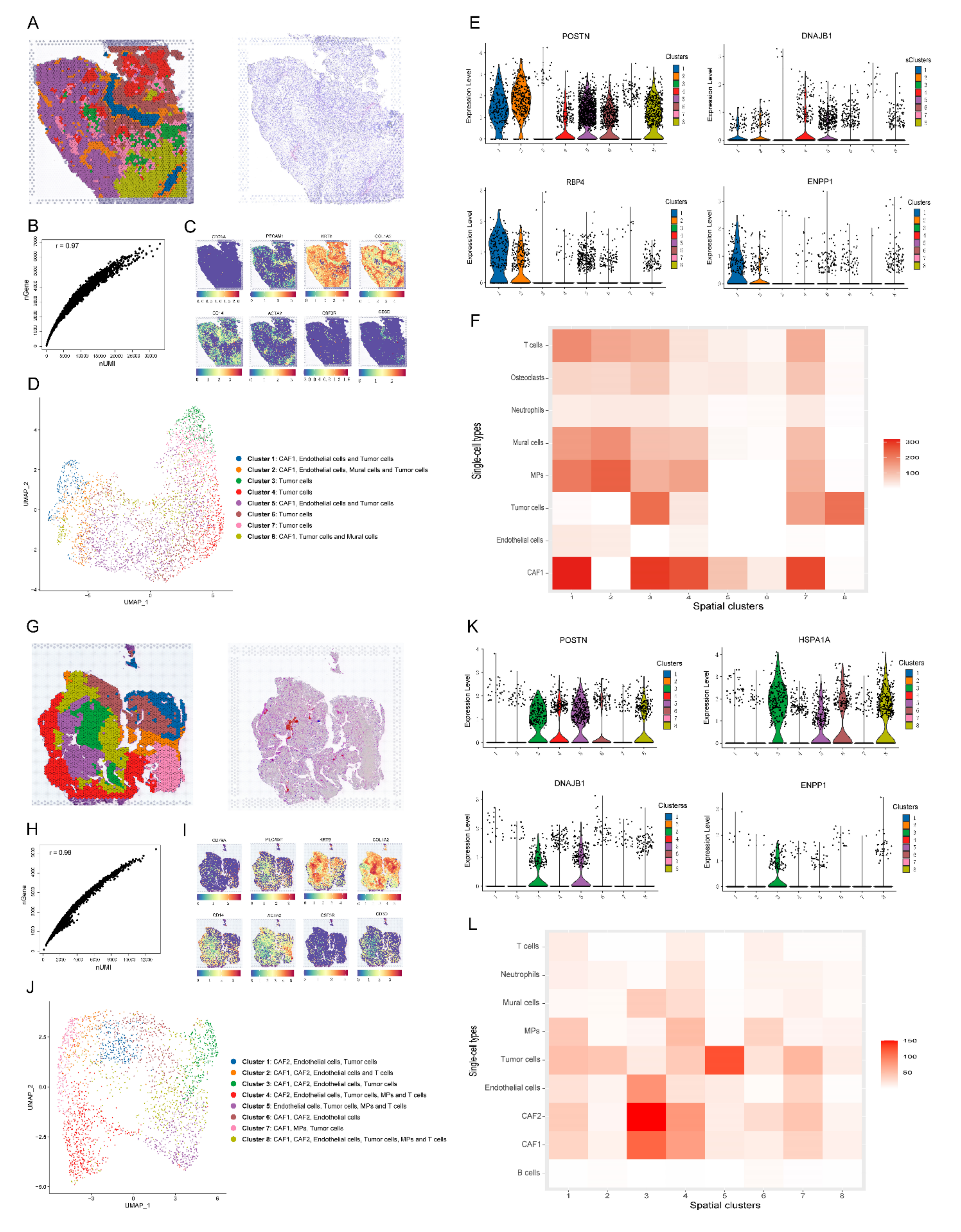 為了進一步剖析脊索瘤組織中 ERS-CAF 的空間特征,該研究對 3 個新鮮腫瘤樣本(包括 2 個原發(fā)腫瘤和 2 個復發(fā)腫瘤)進行了空間轉(zhuǎn)錄組測序;圖 6A 和 G )。在 ST 數(shù)據(jù)中觀察到 UMI 和標記基因之間存在很強的相關(guān)性(圖 6B 和 H),表明質(zhì)量令人滿意。上皮樣細胞(KRT8)、單核吞噬細胞(CD14)、T細胞(CD3D)、內(nèi)皮細胞()的標記基因PECAM1)、中性粒細胞(CSF3R)、B 細胞(CD79A)、成纖維細胞(COL2A1)和壁細胞(ACTA2)在 ST 數(shù)據(jù)中檢測到(圖 6C 和 I)。隨后,通過 UMAP 方法降維,在原發(fā)性和復發(fā)性腫瘤樣本中識別出 8 個主要細胞簇(圖 6D 和 J)。作者在原發(fā)性腫瘤中觀察到 CAF 簇 1,而在復發(fā)腫瘤標本中觀察到 CAF 簇 1 和 ERS-CAF(圖 6D 和 J)。這些發(fā)現(xiàn)通過 CAF 標記基因表達分析(圖 6E 和 K)以及 MIA 結(jié)果(圖 6F 和 L)得到證實。