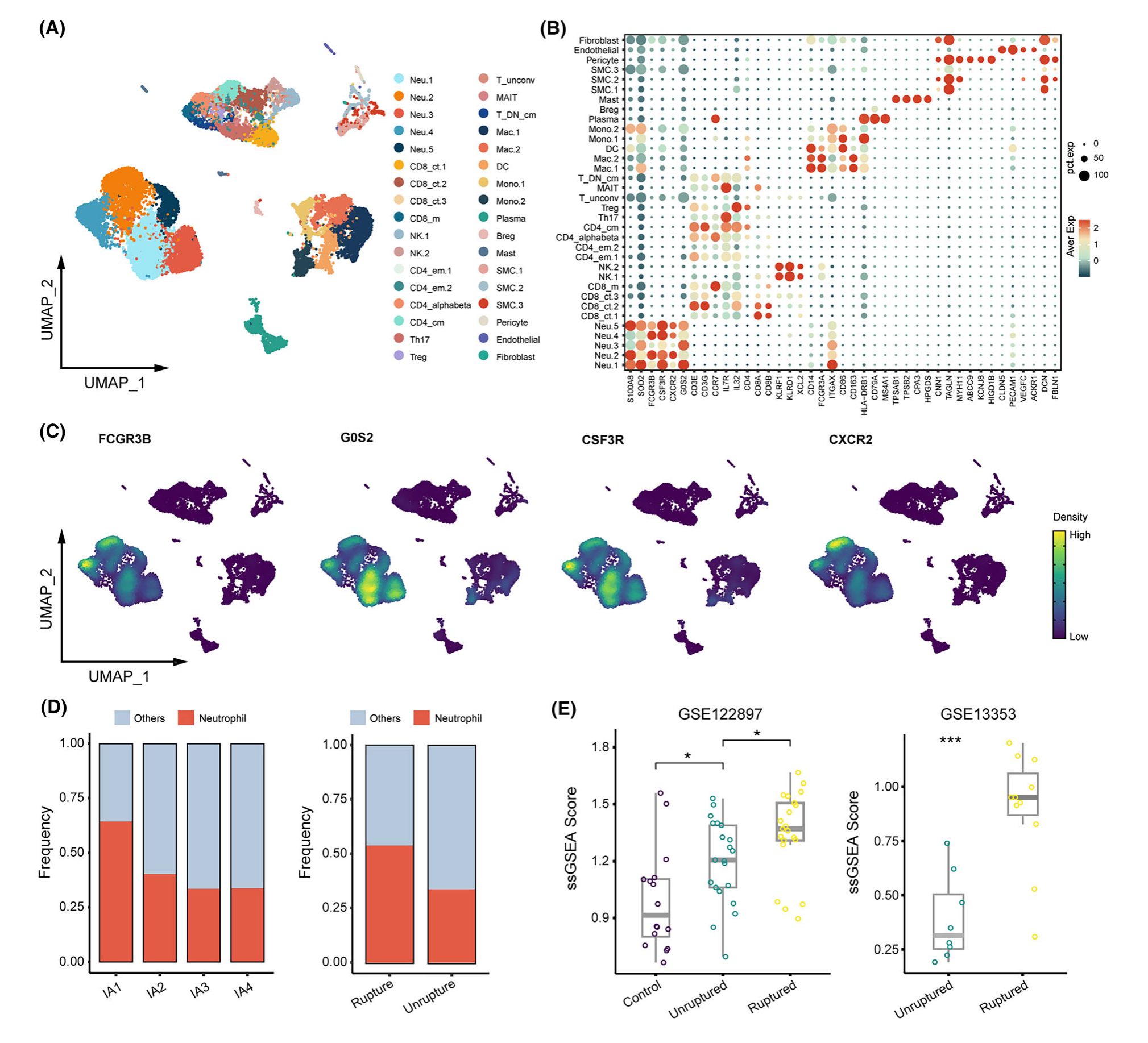 根據(jù)之前明確的基因標(biāo)記,包括FCGR3B、CSF3R、CXCR2G0S2,總共9025個(gè)中性粒細(xì)胞被人工分配(圖1A–C)。該研究進(jìn)一步使用 Azimuth 自動(dòng)注釋這些細(xì)胞,得到 8435 個(gè)中性粒細(xì)胞。IA1 是一種破裂的 IA 組織,與其他樣本相比,其中性粒細(xì)胞數(shù)量最多(圖1D)。總體而言,IA 破裂時(shí)中性粒細(xì)胞較多,這可能與 IA 破裂及隨后的局部血栓形成有關(guān)。值得注意的是,ssGSEA 分析顯示,中性粒細(xì)胞浸潤發(fā)生在 IA 破裂階段。根據(jù)中性粒細(xì)胞獨(dú)特表達(dá)的標(biāo)記基因,當(dāng) IA 破裂時(shí),IA 形成和中性粒細(xì)胞數(shù)量增加(圖1E)??傊?,這些結(jié)果強(qiáng)烈表明中性粒細(xì)胞參與 IA 進(jìn)展。
