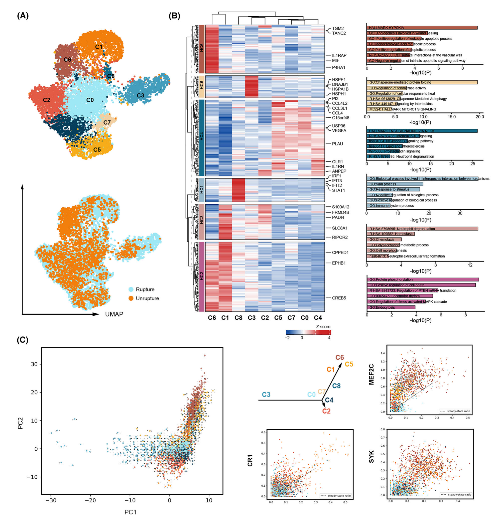 先前的研究表明中性粒細(xì)胞的功能和進(jìn)化具有異質(zhì)性,而IA穹隆中的中性粒細(xì)胞亞群仍然知之甚少。該研究使用“FindClusters”功能以更高分辨率(分辨率?=?0.9)重新聚類中性粒細(xì)胞,以識(shí)別不同的中性粒細(xì)胞群落。結(jié)果,鑒定出八個(gè)中性粒細(xì)胞亞群(C0-C7)(圖2A-B)。富集分析揭示了 C1 和 C6 中細(xì)胞凋亡途徑的正調(diào)節(jié)富集。具體而言,中性粒細(xì)胞胞外池?(NET) 的形成促進(jìn) IA 破裂,在 C1 中富集。對應(yīng)激反應(yīng)、脫顆粒和 NET 形成在 C8 中豐富,伴侶介導(dǎo)的蛋白質(zhì)折疊和自噬在 C3 中豐富,表明這些細(xì)胞也受到應(yīng)激。TNF、NF-κB 和中性粒細(xì)胞脫粒等通路在 C0、C4、C5 和 C7 中富集,表明這些細(xì)胞執(zhí)行中性粒細(xì)胞的促炎功能。此外,還進(jìn)行了 RNA 速度分析來描繪中性粒細(xì)胞亞簇的潛在軌跡。結(jié)果,這些細(xì)胞形成了包含兩個(gè)分支的軌跡。C5 和 C6 亞簇可能是軌跡的末端,CR1、MEF2C?和?SYK?參與細(xì)胞凋亡(圖 2C)。