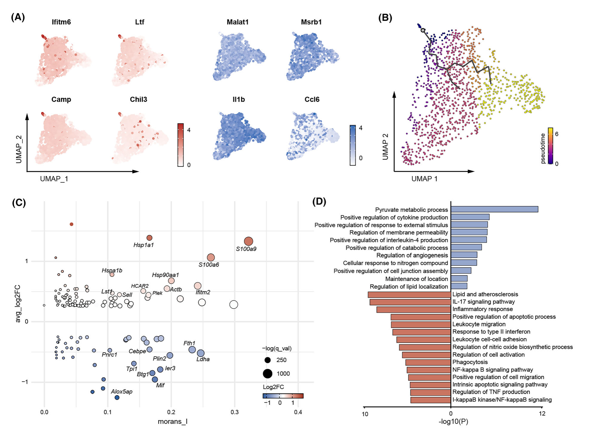 最近的研究根據(jù)中性粒細(xì)胞從骨髓到外周血的遷移決定了中性粒細(xì)胞的轉(zhuǎn)錄組特征,即“中性粒細(xì)胞”。該研究基于scRNA-Seq數(shù)據(jù)集研究了小鼠 IA 模型中性粒細(xì)胞浸潤到IA組織時(shí)是否存在這種轉(zhuǎn)錄組特征。結(jié)果顯示假手術(shù)中存在少量中性粒細(xì)胞富集,并形成小鼠模型高表達(dá)的基因標(biāo)記,包括Ifitm6、Ltf、Camp?和?Chil3。這些細(xì)胞表達(dá)較低成熟或老化的基因標(biāo)記,如Malat1、Msrb1、Il1bCcl6(圖?3A),表明它們是從外周血新滲入的。執(zhí)行單片算法來識(shí)別細(xì)胞進(jìn)化軌跡,并將這些新滲透的細(xì)胞指定為起點(diǎn)(圖3B)。根據(jù)莫蘭斯指數(shù) (morans I) 以及未破裂(假手術(shù))和破裂小鼠模型中的基因表達(dá),該研究計(jì)算了 IA 組織中新浸潤和老化中性粒細(xì)胞的基因特征(圖3C)。與之前的研究一致,新浸潤的中性粒細(xì)胞高表達(dá)Cebpe,在粒細(xì)胞生成和炎癥因子產(chǎn)生中發(fā)揮作用,而相對老化的中性粒細(xì)胞表達(dá)S100a 家族基因和伴侶,如?Hspa1b、Has1a1??Hsp90aa1,表明壓力或衰老狀態(tài)。富集分析揭示了這些細(xì)胞的不同功能,新浸潤的中性粒細(xì)胞中富集了多種代謝途徑,而老化的中性粒細(xì)胞則激活了炎癥和凋亡相關(guān)途徑(圖3D)。總之,這些結(jié)果表明 IA 組織中存在中性粒細(xì)胞,并強(qiáng)調(diào)了它們的功能異質(zhì)性。