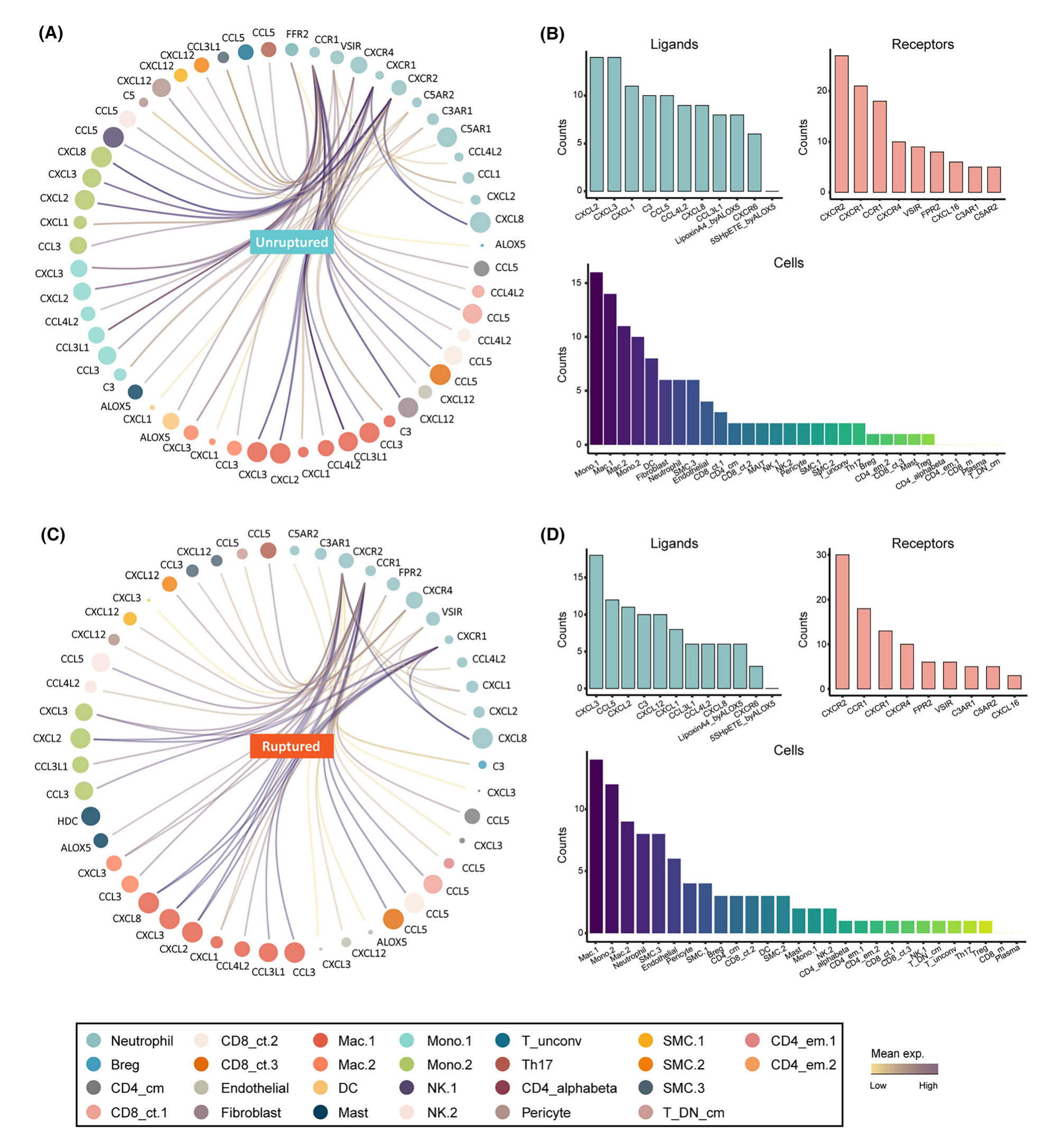 在之前的研究中忽略了中性粒細(xì)胞向 IA 組織的局部募集,為了填補(bǔ)這一空白,使用 cellphoneDB 算法進(jìn)行了細(xì)胞間通信分析。該研究首先表征了未破裂 IA 組織中參與中性粒細(xì)胞募集的細(xì)胞和細(xì)胞因子。結(jié)果顯示血管細(xì)胞(內(nèi)皮細(xì)胞、SMC 和周細(xì)胞)和免疫細(xì)胞(單核/巨噬/DC、中性粒細(xì)胞、T/B 淋巴細(xì)胞和肥大細(xì)胞)廣泛產(chǎn)生中性粒細(xì)胞趨化因子(圖4A)。高頻趨化因子包括 CXCL2/3/1,它與 CXCR2/1 和 CCR1 等中性粒細(xì)胞受體結(jié)合(圖 4B)。在未破裂的 IA 中,主要參與中性粒細(xì)胞募集的細(xì)胞是單核細(xì)胞/巨噬細(xì)胞,包括 Mono.1/2 和 Macro.1/2。在破裂的 IA 中招募中性粒細(xì)胞的趨化因子與未破裂的 IA 中的趨化因子表現(xiàn)出相似的模式組成,但對 CXCL3 和 CCL5 的依賴性更高(圖 4C,D)。接收這些信號的中性粒細(xì)胞受體是保守的(圖4D)。
