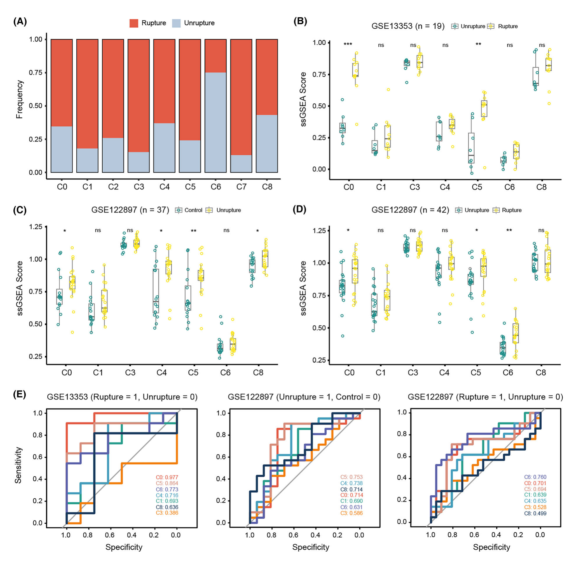 為了研究中性粒細(xì)胞浸潤的病理意義,該研究首先展示了破裂和未破裂樣本中每種類型的中性粒細(xì)胞的比例。破裂樣本中除 C6 之外的中性粒細(xì)胞亞群有所增加(圖5A)。該研究進(jìn)一步整理了這些中性粒細(xì)胞的基因特征,發(fā)現(xiàn)C0和C5在破裂的IA組織中顯著富集(圖5B,D)。此外,與正常血管組織相比,未破裂 IA 中的 C0 和 C5 也顯著富集,與 C4 和 C8 相同(圖5C),表明中性粒細(xì)胞參與 IA 形成和破裂。接下來,進(jìn)行 ROC 分析以評估中性粒細(xì)胞亞群與 IA 形成和破裂之間的關(guān)聯(lián)。結(jié)果顯示C0和C6的ssGSEA評分在預(yù)測IA破裂方面產(chǎn)生了令人滿意的AUC值(兩個(gè)數(shù)據(jù)集中的AUC?>?0.7)(圖5E),表明這些細(xì)胞可能參與IA破裂。反過來,C4 和 C5 在預(yù)測 IA 形成方面表現(xiàn)良好。在此基礎(chǔ)上,C0 和 C5 的局部滲透分別是 IA 破裂和形成的有力預(yù)測因子。
