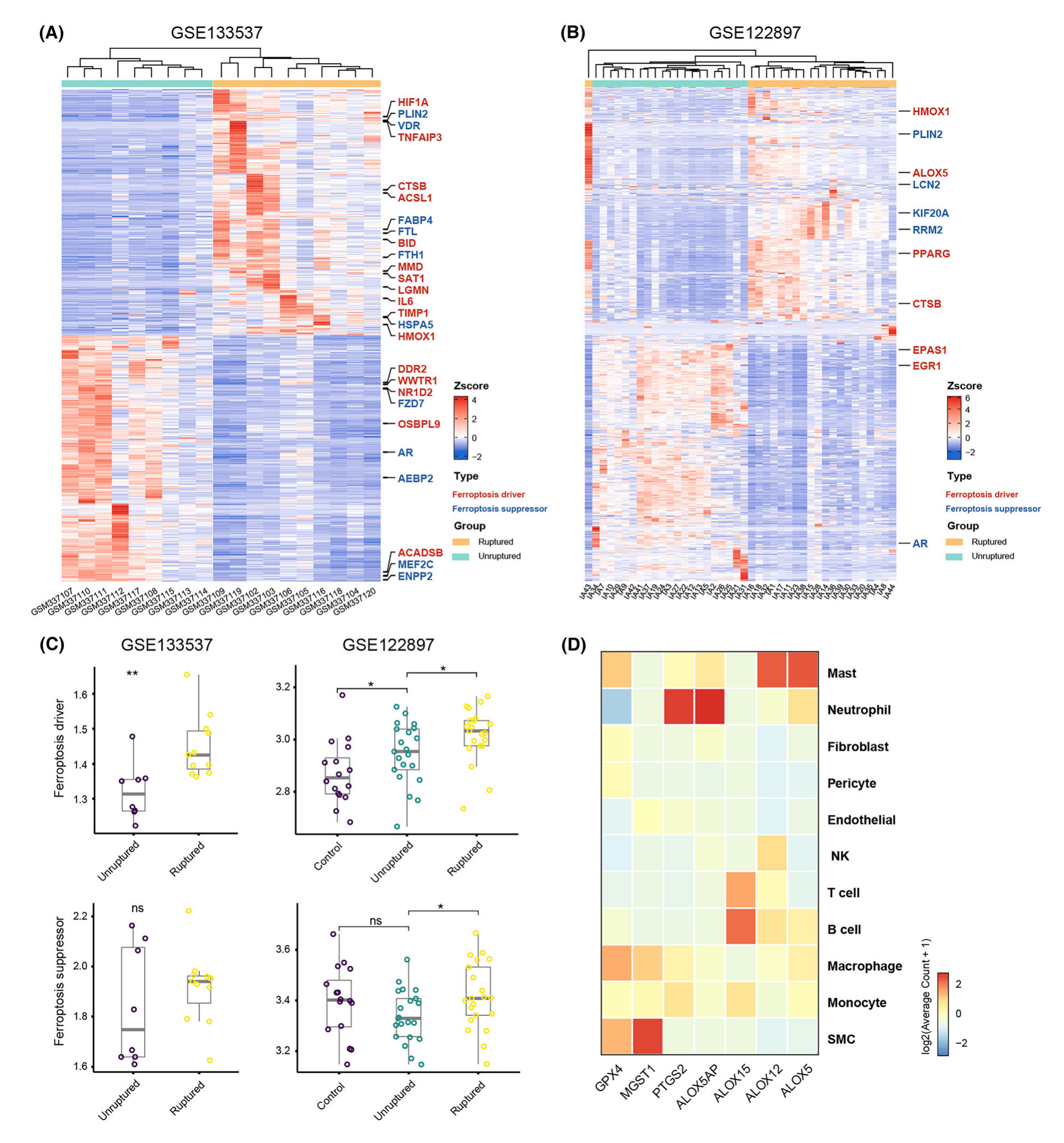 中性粒細(xì)胞介導(dǎo)的炎癥對 IA 壁具有破壞性。最近,新出現(xiàn)的證據(jù)表明,中性粒細(xì)胞在某些情況下對鐵死亡敏感,這將進(jìn)一步促進(jìn)局部炎癥級聯(lián)反應(yīng)并促進(jìn) IA 進(jìn)展。在此,該研究描述了 IA 中中性粒細(xì)胞與鐵死亡之間的潛在關(guān)聯(lián)。該研究根據(jù)兩個(gè)批量轉(zhuǎn)錄組數(shù)據(jù)集計(jì)算了 DEG,并注釋了鐵死亡驅(qū)動(dòng)基因和抑制基因(圖 6A,B)。結(jié)果顯示在破裂的 IA 組織中,幾個(gè)鐵死亡驅(qū)動(dòng)基因和抑制基因有顯著差異,表明鐵死亡途徑失調(diào)。破裂的 IA 組織的鐵死亡驅(qū)動(dòng)基因 ssGSEA 評分高于未破裂組織,而抑制基因的 ssGSEA 評分相當(dāng)(圖6C),表明鐵死亡與 IA 破裂之間存在關(guān)聯(lián)。值得注意的是,未破裂的 IA 組織的鐵死亡驅(qū)動(dòng)基因得分高于對照樣本,表明鐵死亡也可能參與 IA 的形成。多個(gè)基因與中性粒細(xì)胞鐵死亡有關(guān),例如谷胱甘肽過氧化物酶 4(GPX4) 和微粒體谷胱甘肽 S 轉(zhuǎn)移酶 1 (MGST1) 充當(dāng)鐵死亡抑制劑;花生四烯酸脂氧合酶 5(ALOX5)、花生四烯酸脂氧合酶 5 激活蛋白(ALOX5AP)、花生四烯酸脂氧合酶 12(ALOX12)、花生四烯酸脂氧合酶 15(ALOX15) 和前列腺素 2(PTGS2) 充當(dāng)鐵死亡驅(qū)動(dòng)程序。在單細(xì)胞分辨率下,中性粒細(xì)胞高表達(dá)PTGS2和ALOX5AP(圖6D),它們與鐵死亡顯著相關(guān),表明這些細(xì)胞參與前列腺素和白三烯的產(chǎn)生,并且對鐵死亡敏感。盡管數(shù)量較少,但肥大細(xì)胞高度表達(dá) ALOX5 和 ALOX12。鑒于白三烯可以通過多細(xì)胞協(xié)同方式產(chǎn)生,局部白三烯可能是由中性粒細(xì)胞和肥大細(xì)胞以協(xié)同方式產(chǎn)生的??傊@些結(jié)果表明 IA 組織中中性粒細(xì)胞的鐵死亡可能是由 ALOX5AP 和 PTGS2 驅(qū)動(dòng)的,并且可以由肥大細(xì)胞促進(jìn)。