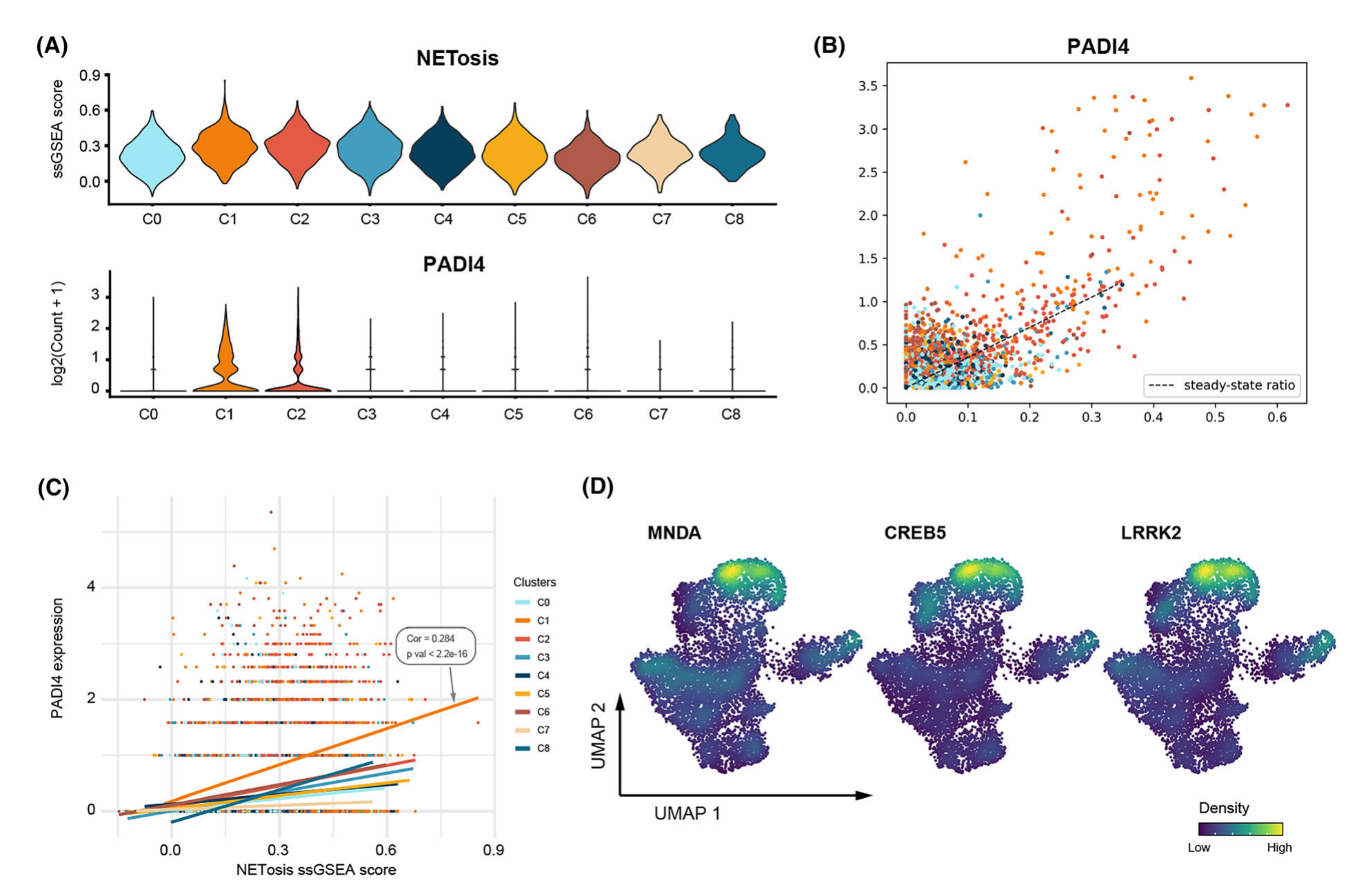 NET 的產(chǎn)生是中性粒細(xì)胞導(dǎo)致 IA 破裂的另一種方式,且取決于稱為 NETosis 的過程。因此,抑制 NETosis 是 IA 有前景的治療靶點(diǎn)。然而,由于這些細(xì)胞的多功能性,發(fā)生 NETosis 的中性粒細(xì)胞亞群尚不清楚。作者的結(jié)果表明 NETs 形成信號通路在 C1 中富集(圖2B)。該研究從京都基因和基因組百科全書 (KEGG) 數(shù)據(jù)庫中收集了人類 NETosis 基因特征,發(fā)現(xiàn) NETosis 的 ssGSEA 評分在 C1 中升高(圖7A)。PADI4?的表達(dá)對于組蛋白瓜氨酸化至關(guān)重要,在 C1 中上調(diào),并表現(xiàn)出正相關(guān)的未剪接/剪接 mRNA 比率(圖 7B),表明PADI4在驅(qū)動(dòng)C1 NETosis中發(fā)揮作用。此外,PADI4的表達(dá)與C1中NETosis的ssGSEA評分成正比(圖7C),證實(shí)C1易于發(fā)生NETosis。與其他中性粒細(xì)胞相比該中性粒細(xì)胞子集專門表達(dá)?MNDA?(Pct.1?=?91.8%, Pct.2?=?54.5%),?CREB5?(Pct.1?=?74.7%, Pct.2?= 33.7%) 和?LRKK2?(Pct.1?=?78.4%, Pct.2?=?36.2%) ?(圖7D),因此可以作為抑制 NETs 介導(dǎo)的 IA 進(jìn)展的目標(biāo)。