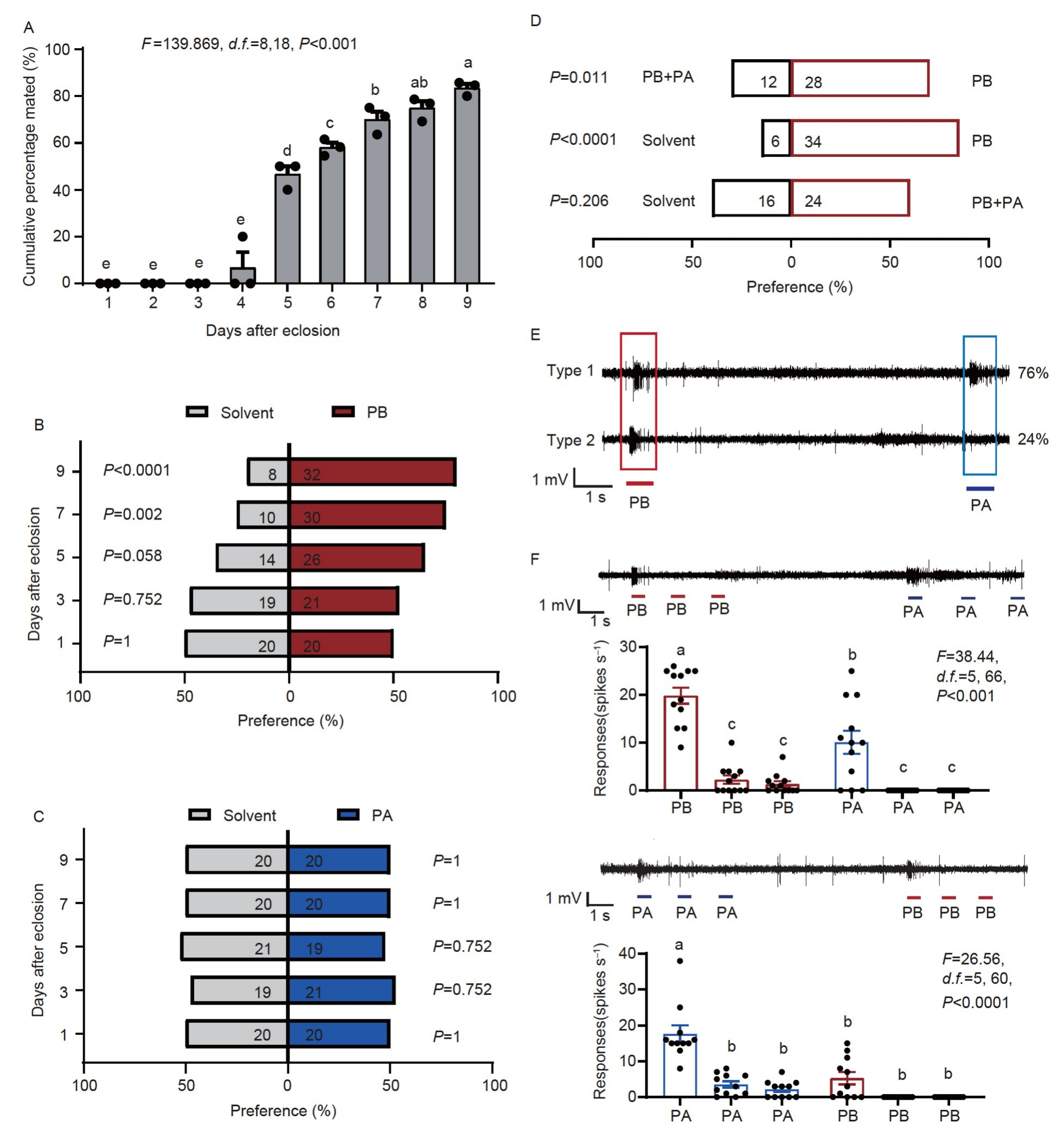研究團(tuán)隊(duì)使用Y型管嗅覺儀對(duì)不同日齡的雄蟲進(jìn)行了行為學(xué)測(cè)試,以觀察它們對(duì)PB和PA的反應(yīng)。此外,通過視頻記錄和分析,評(píng)估了雄蟲的交配行為。交配率在5 DAE時(shí)增加到近50%,6 DAE時(shí)增加到60%以上,此后緩慢而穩(wěn)定地積累(圖1A)。雄蟲對(duì)PB和PA的偏好測(cè)試結(jié)果反應(yīng),PB是主要的性信息素成分,能夠顯著吸引雄蟲。而PA雖然單獨(dú)存在時(shí)不吸引雄蟲,但其存在能夠減弱PB的吸引作用(圖1B-D),表明PA可能在調(diào)節(jié)性行為中起到平衡作用。