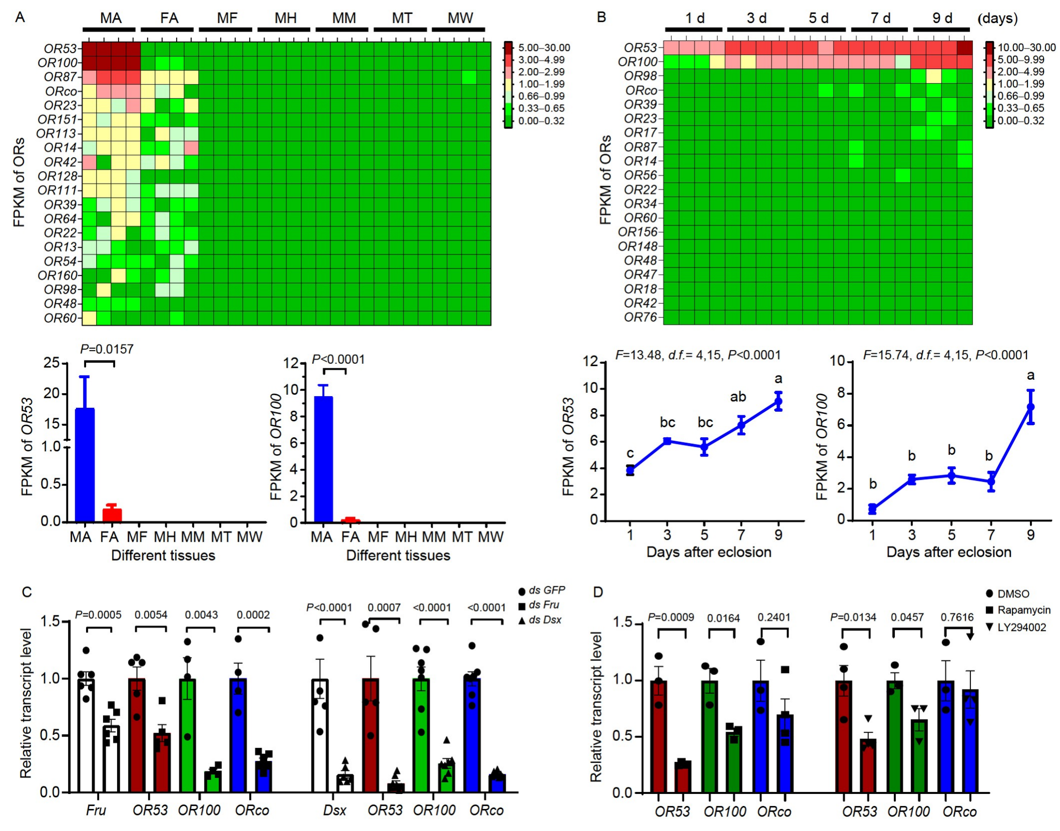 研究人員利用Bulk RNA測(cè)序技術(shù)分析了雄蟲不同組織中嗅覺受體基因的表達(dá)情況,并通過果蠅遺傳學(xué)方法,將美洲大蠊的嗅覺受體基因在果蠅中表達(dá),以鑒定PA和PB的受體。通過RNA測(cè)序分析得到的嗅覺受體基因在不同組織(雄蟲觸角-MA、雌蟲觸角-FA、雄蟲前足-MF、雄蟲頭部-MH、雄蟲口器-MM、雄蟲精巢-MT和雄蟲翅-MW)和不同日齡中的表達(dá)水平(圖2A、2B),以及通過qPCR驗(yàn)證的OR53、OR100ORco基因在雄蟲觸角中敲除frudsx基因后的表達(dá)水平(圖2C),以及經(jīng)過營(yíng)養(yǎng)信號(hào)通路抑制劑處理后的表達(dá)水平變化(圖2D)。研究鑒定出OR53OR100為PA/PB和PA的受體,并發(fā)現(xiàn)它們?cè)谛巯x觸角中的表達(dá)模式與行為測(cè)定結(jié)果相吻合,證實(shí)了這兩種受體在性信息素感知中的關(guān)鍵作用。