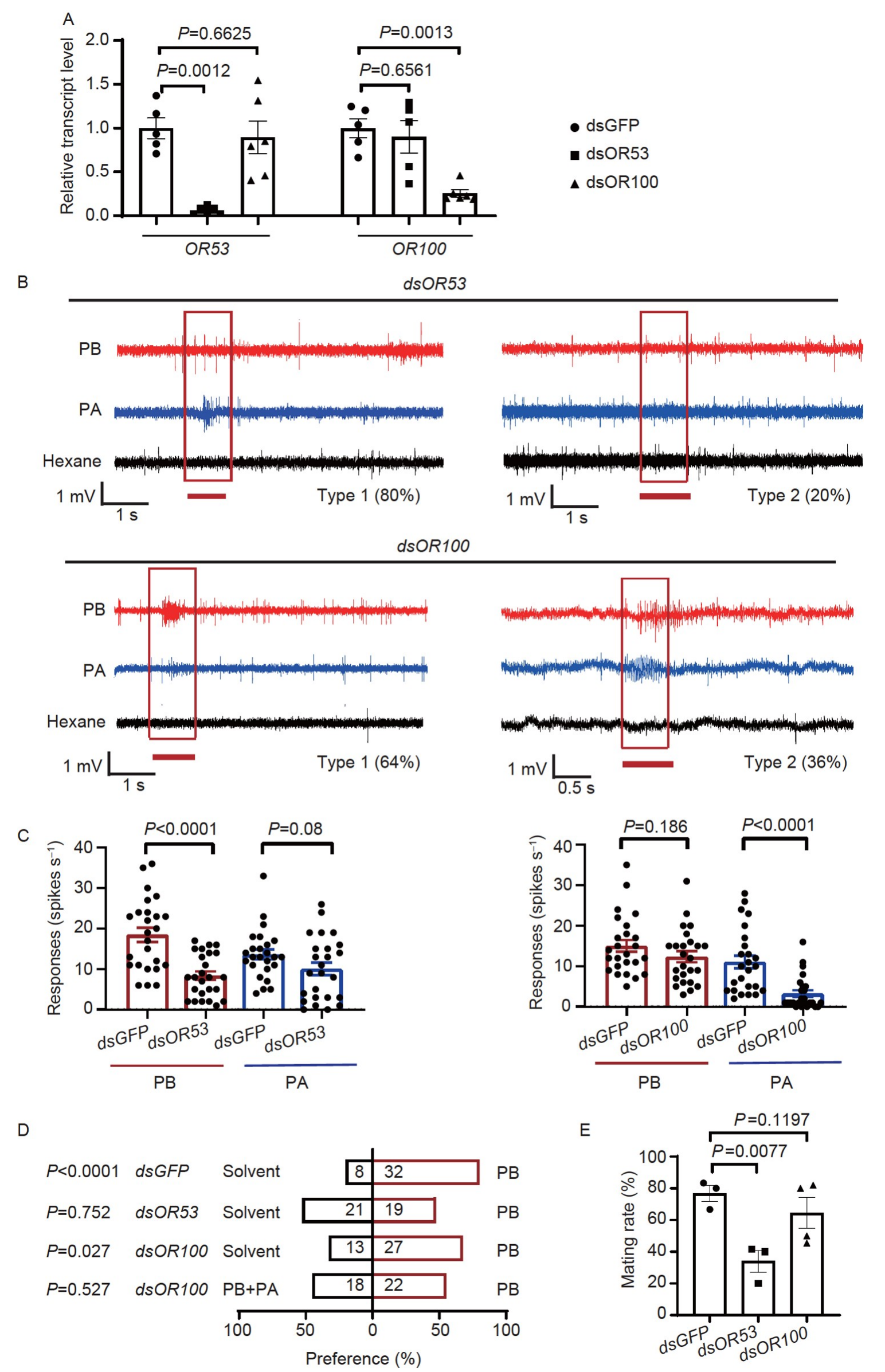 研究人員利用UAS-OR53UAS-OR100轉(zhuǎn)基因果蠅品系,通過RNAi實(shí)驗(yàn)敲除了美洲大蠊中的OR53OR100基因,進(jìn)而研究這些嗅覺受體在求偶交配行為中的作用。敲除這些基因后對(duì)PA和PB反應(yīng)的SSR測(cè)試結(jié)果,敲低OR53的表達(dá)顯著削弱了ORN對(duì)PB的反應(yīng),但對(duì)ORN對(duì)PA的反應(yīng)只有輕微的影響(圖3B)。OR53OR100基因敲除對(duì)雄蟲行為選擇和交配率的影響(圖3D、3E)。敲除實(shí)驗(yàn)證實(shí)了OR53OR100在性信息素感知和行為調(diào)控中的關(guān)鍵作用,特別是OR53在PB誘導(dǎo)的求偶交配行為中的重要性。OR100的敲除則表明PA可能通過OR100發(fā)揮調(diào)節(jié)作用。