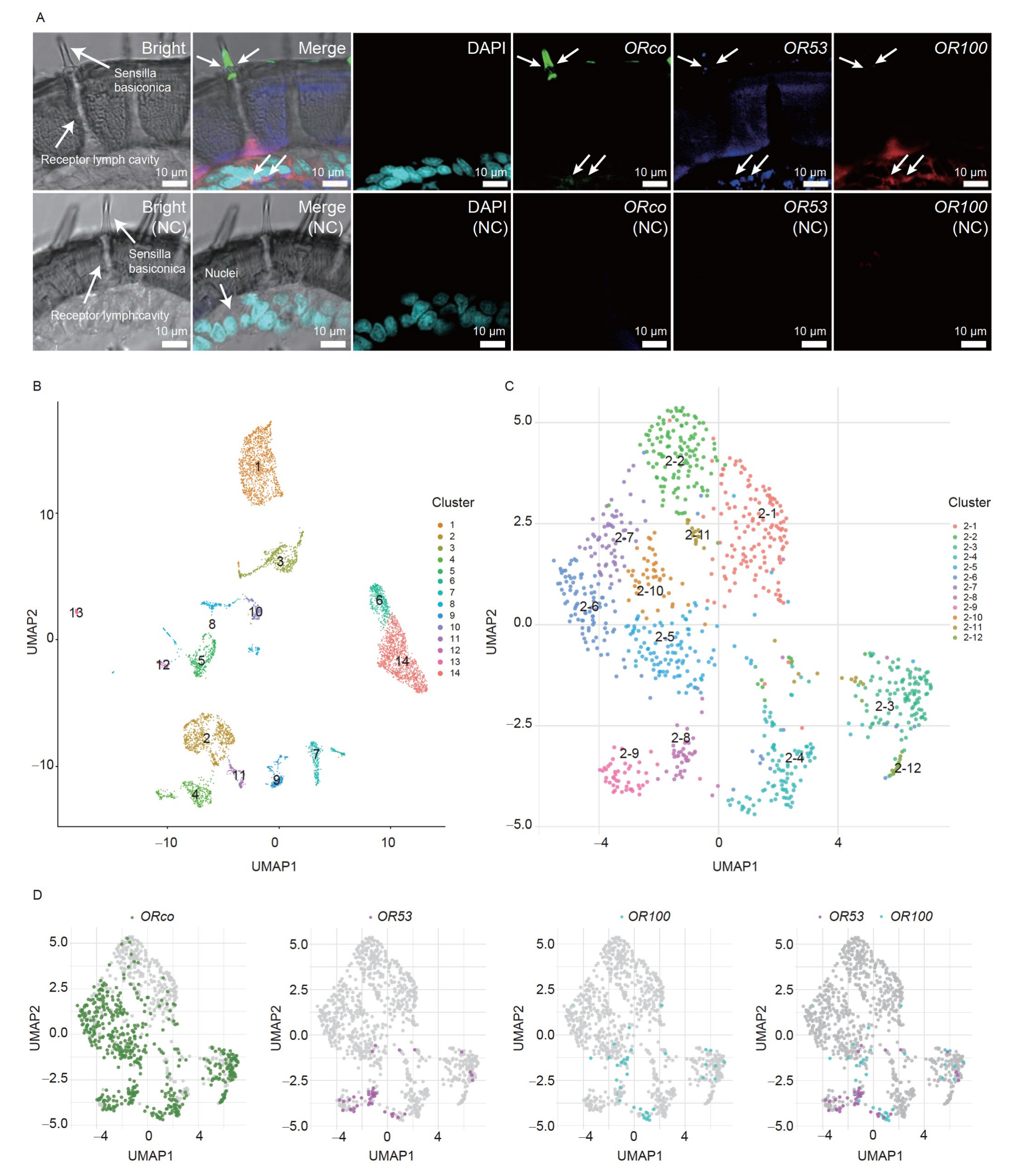 研究人員利用FISH技術(shù),觀察到OR53、OR100ORco經(jīng)常在同一個(gè)感受器中表達(dá),說明大多數(shù)基本感受器同時(shí)含有OR53OR100的ORN。為了更系統(tǒng)地研究OR基因的表達(dá),研究人員使用性成熟雄蟲的觸角進(jìn)行了單細(xì)胞測(cè)序。測(cè)定每簇細(xì)胞的基因表達(dá)水平,鑒定出Cluster 2為ORco高表達(dá)的ORN(圖4B)。進(jìn)一步分析Cluster 2細(xì)胞得到12個(gè)亞型(圖4C)。其中大部分感受器同時(shí)具有OR53OR100兩種OR53 ORNs,而少數(shù)感受器僅具有OR53?ORNs。12個(gè)亞型中有4個(gè)同時(shí)表達(dá)OR53OR100,可能對(duì)應(yīng)于主要的1-型感受器的ORNs。在2-亞型中,還發(fā)現(xiàn)了OR53的顯著表達(dá)亞型,可能對(duì)應(yīng)2型感受器的ORNs,也可能只有少量的感受器OR100?ORNs(圖4D)。這些結(jié)果進(jìn)一步支持了性成熟雄蟲觸角中至少存在兩種錐形感受器。