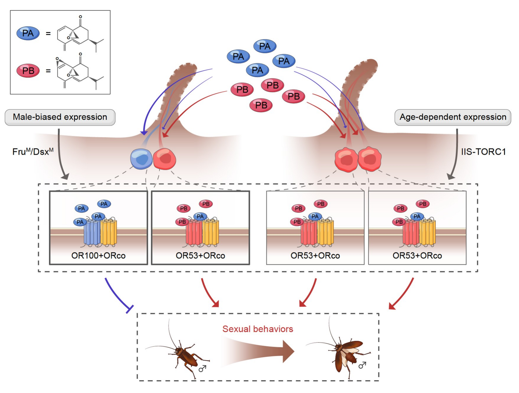 研究結(jié)果表明,PB作為主要的性信息素成分,通過激活OR53受體來(lái)誘導(dǎo)雄蟲的求偶交配行為。而PA雖然單獨(dú)存在時(shí)不吸引雄蟲,但其存在能夠通過兩種可能的途徑減弱PB的吸引作用:一是PA與PB競(jìng)爭(zhēng)激活相同的受體OR53,二是PA通過激活其特定的受體OR100來(lái)抑制性行為。該研究確定了兩種性信息素嗅覺受體以及可能調(diào)控雄蟲特異性和年齡依賴性求偶交配行為的分子機(jī)制,有助于發(fā)展綠色防蟑技術(shù)及害蟲綜合管理策略。