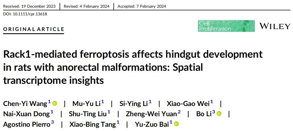 2024年7月,中國(guó)醫(yī)科大學(xué)盛京醫(yī)院在國(guó)際學(xué)術(shù)期刊cell proliferation發(fā)表一項(xiàng)重要研究成果,題為:Rack1‐mediated ferroptosis affects hindgut development in rats with anorectal malformations: Spatial transcriptome insights。使用空間轉(zhuǎn)錄組測(cè)序、免疫熒光、CCK-8、WB、ROS檢測(cè)等來(lái)剖析直腸肛門畸形的發(fā)育機(jī)制。