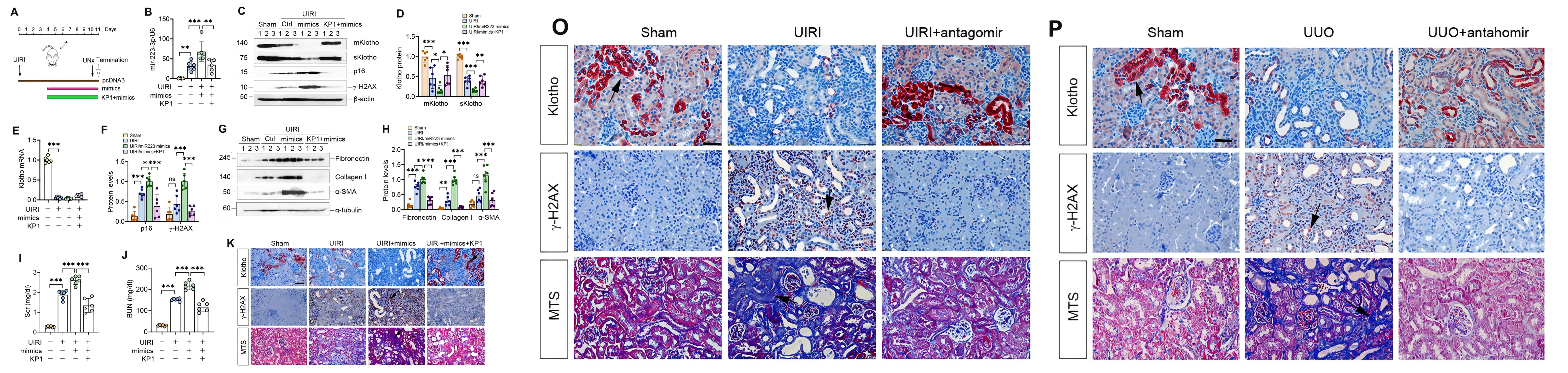 為了證實 miR-223-3p 在 Klotho 表達中的調(diào)節(jié)作用,作者進行了雙熒光素酶報告基因測定,轉(zhuǎn)染 miR-223-3p 模擬物降低了含有野生型未突變型 Klotho mRNA 序列的報告基因的熒光素酶活性,表明 miR-223-3p 可以特異性靶向 Klotho mRNA,抑制其活性,用miR-223-3p轉(zhuǎn)染HK-2細胞進一步證明miR-223-3p抑制 HK-2 細胞中 Klotho 蛋白的表達。體內(nèi)模型原位雜交驗證了miR-223-3p 在 UIRI 腎腎小管上皮中被誘導(dǎo),而KP1抑制了miR-223-3p表達,結(jié)合免疫熒光染色結(jié)果證明了KP1 可以通過在體內(nèi)抑制 miR-223-3p 來恢復(fù) Klotho 表達,在體外的HK-2 細胞中的miR-223-3p及其拮抗劑轉(zhuǎn)染實驗也呈現(xiàn)出了相同的結(jié)果。