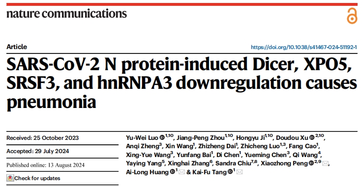 Luo YW, Zhou JP, Ji H, Xu D, Zheng A, Wang X, Dai Z, Luo Z, Cao F, Wang XY,Bai Y, Chen D, Chen Y, Wang Q, Yang Y, Zhang X, Chiu S, Peng X, Huang AL, Tang KF. SARS-CoV-2 N protein-induced Dicer, XPO5, SRSF3, and hnRNPA3 downregulation causes pneumonia.?Nat Commun. 2024 Aug 13;15(1):6964. doi:10.1038/s41467-024-51192-1.