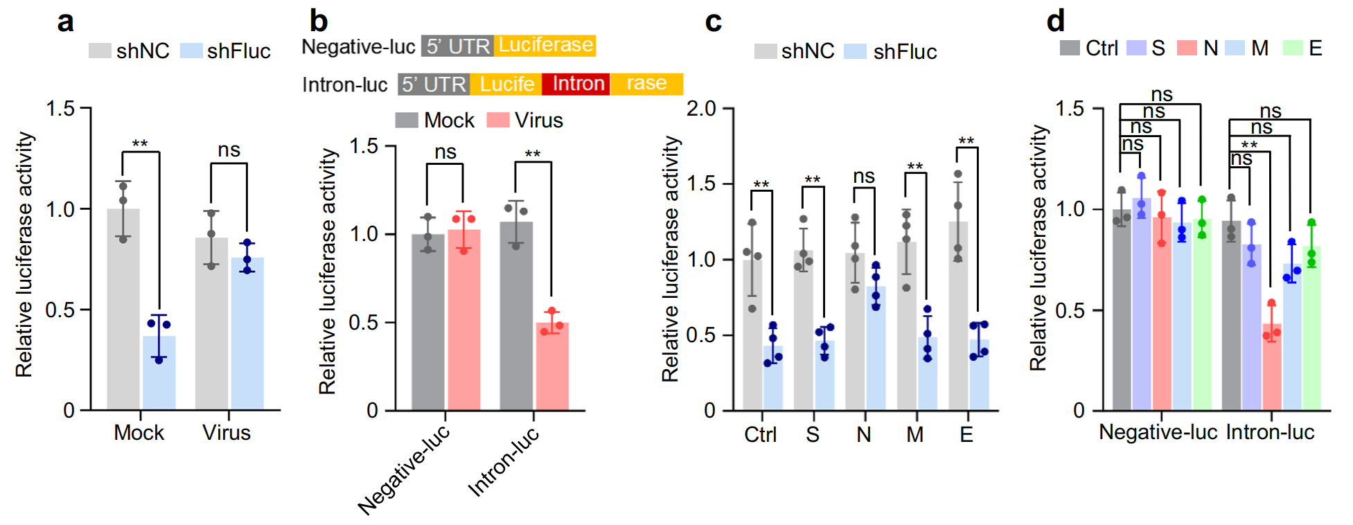 本研究通過(guò)數(shù)據(jù)庫(kù)檢索及分子實(shí)驗(yàn)驗(yàn)證先初步推測(cè)SARS-CoV-2 N蛋白的年齡依賴(lài)調(diào)控機(jī)制與RNAi以及可變剪接相關(guān),之后通過(guò)組學(xué)測(cè)序在整體水平上驗(yàn)證了猜測(cè)并進(jìn)一步細(xì)化了調(diào)控方式,之后再通過(guò)大量過(guò)表達(dá)及敲降后對(duì)應(yīng)分子在RNA及蛋白水平的定量驗(yàn)證了結(jié)果,是一個(gè)比較經(jīng)典有效的實(shí)驗(yàn)思路,可以在其他實(shí)驗(yàn)中參考。