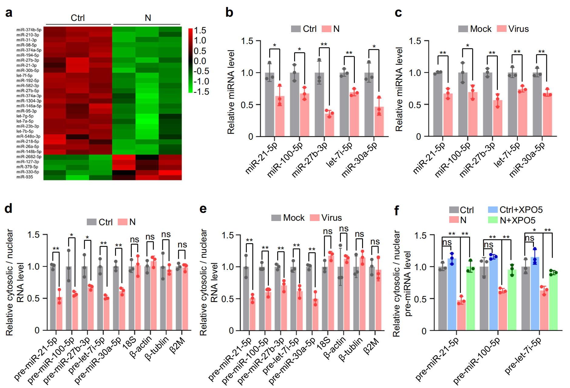 XPO5Dicer在 miRNA 生物合成中起關(guān)鍵作用,小 RNA 深度測(cè)序顯示,N 蛋白誘導(dǎo) miRNA 表達(dá)的整體下調(diào),對(duì) A549 和 BEAS-2B 細(xì)胞中表達(dá)量最高的前五個(gè) miRNA進(jìn)行定量驗(yàn)證顯示,它們?cè)诒磉_(dá) N 蛋白的細(xì)胞和 SARS-CoV-2 感染的細(xì)胞中均下調(diào);生化分級(jí)分離實(shí)驗(yàn)顯示,異位 N 蛋白表達(dá)或 SARS-CoV-2 感染誘導(dǎo) pre-miRNA 的核保留,如細(xì)胞核中 pre-miRNA 水平的增加和細(xì)胞質(zhì)中 pre-miRNA 水平的降低所示,?XPO5過(guò)表達(dá)后得到緩解。此外,異位 N 蛋白表達(dá)或 SARS-CoV-2 感染降低了成熟 miRNA 和 pre-miRNA 之間的比率,Dicer過(guò)表達(dá)后得到緩解。總體而言,這些發(fā)現(xiàn)表明,N 蛋白通過(guò)降低?XPO5?表達(dá)阻斷 pre-miRNA 從細(xì)胞核到細(xì)胞質(zhì)的運(yùn)輸,并通過(guò)下調(diào)?Dicer?表達(dá)抑制 pre-miRNA 向成熟 miRNA 的加工。