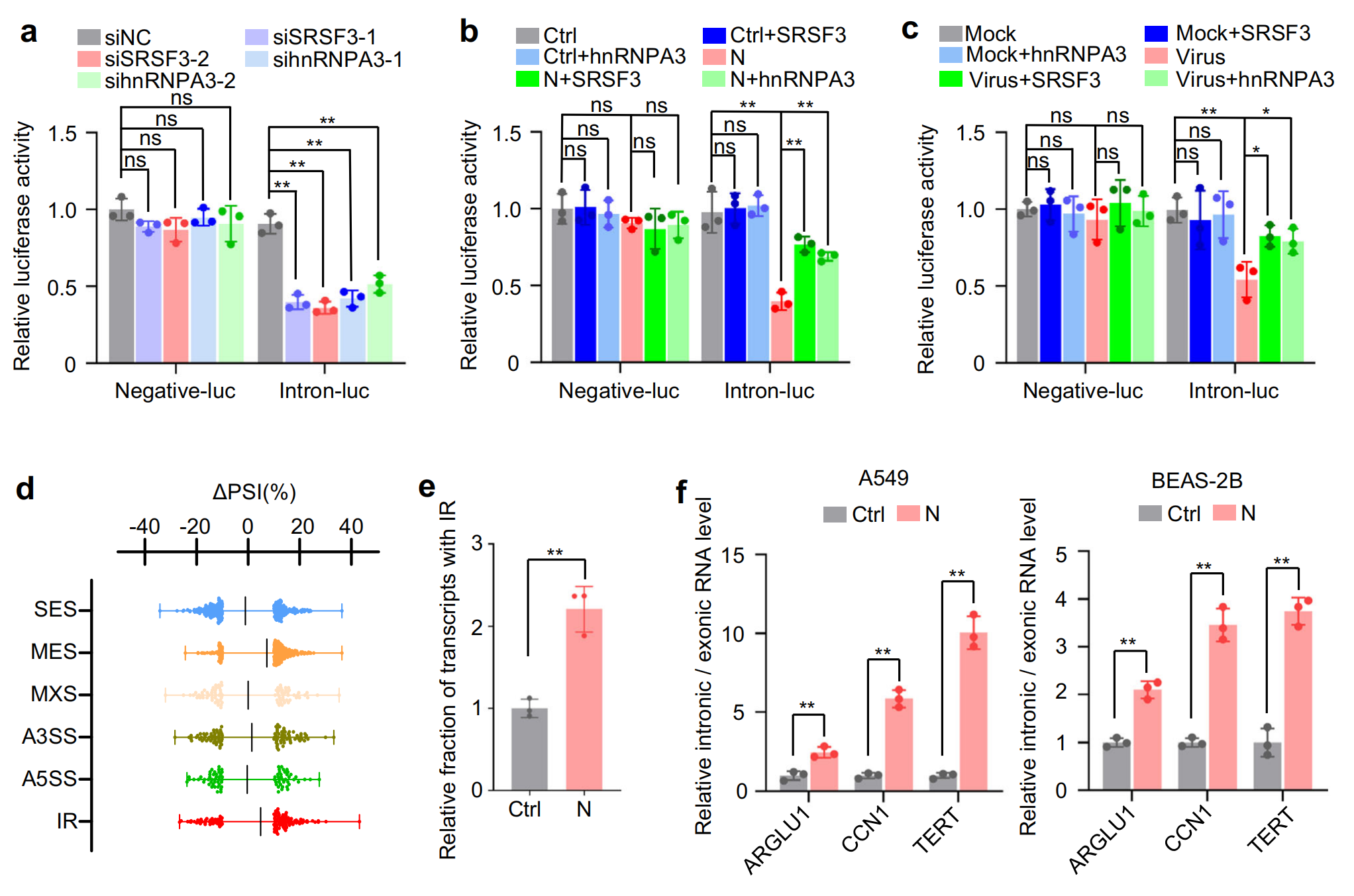 SRSF3hnRNPA3敲除抑制了含有內(nèi)含子的報(bào)告基因小基因的剪接,證實(shí)了它們確實(shí)是剪接因子,而它們的過(guò)表達(dá)部分緩解了 N 蛋白或 SARS-CoV-2 感染對(duì) RNA 剪接的抑制作用,進(jìn)一步進(jìn)行全長(zhǎng)轉(zhuǎn)錄組測(cè)序,通過(guò)可變剪接分析發(fā)現(xiàn),N 蛋白誘導(dǎo)內(nèi)含子保留。此外,RT-qPCR證實(shí),異位 N 蛋白表達(dá)或 SARS-CoV-2 感染降低了一組內(nèi)源性?xún)?nèi)含子的剪接效率,SRSF3?和?hnRNPA3?過(guò)表達(dá)部分減輕了 N 蛋白和 SARS-CoV-2 對(duì) RNA 剪接的抑制作用,這些結(jié)果表明,N 蛋白通過(guò)降低?SRSF3?和?hnRNPA3?的表達(dá)來(lái)抑制 RNA 剪接。