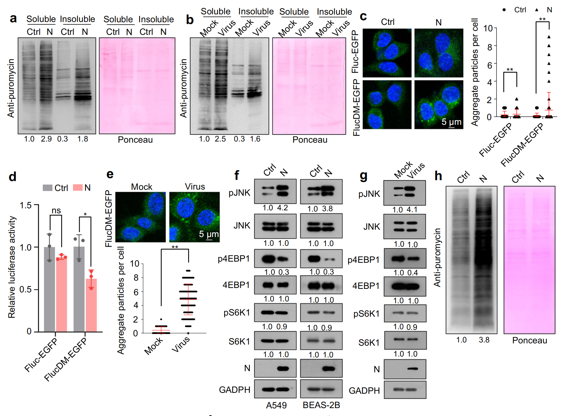 剪接抑制會(huì)誘導(dǎo)廣泛的 IR 和隨后的內(nèi)含子保留 mRNA 的翻譯,一部分內(nèi)含子衍生的多肽容易縮合且具有蛋白毒性,用嘌呤霉素對(duì)新生多肽進(jìn)行代謝標(biāo)記,結(jié)果顯示異位 N 蛋白表達(dá)或 SARS-CoV-2 感染誘導(dǎo)不溶性蛋白合成增加,而N蛋白與RNA的結(jié)合主要在可溶性蛋白部分被檢測(cè)到,免疫熒光檢測(cè)結(jié)果表明,N 蛋白和 SARS-CoV-2 感染誘導(dǎo)了 EGFP 聚集體的產(chǎn)生,誘導(dǎo)蛋白毒性應(yīng)激。