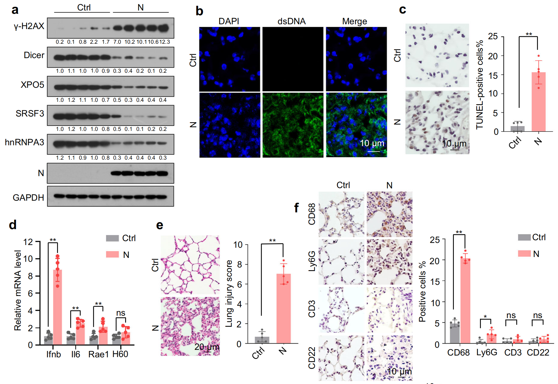 小鼠體內(nèi)驗(yàn)證結(jié)果顯示, N 蛋白在小鼠肺組織中的表達(dá)導(dǎo)致?Dicer、XPO5、SRSF3?和?hnRNPA3?下調(diào)、DNA 損傷、胞質(zhì) DNA 積累、細(xì)胞凋亡、IFNβ、IL-6 和 NKG2D 配體上調(diào),以及伴有明顯巨噬細(xì)胞浸潤(rùn)的肺炎,肺組織中?Dicer、XPO5、SRSF3?和?hnRNPA3?敲低導(dǎo)致肺損傷和肺炎,而它們的過(guò)表達(dá)部分緩解了 N 蛋白誘導(dǎo)的肺炎,這些結(jié)果表明,N 蛋白誘導(dǎo)的?Dicer、XPO5、SRSF3?和?hnRNPA3?蛋白表達(dá)下調(diào)是 SARS-CoV-2 誘導(dǎo)肺炎的一種機(jī)制。