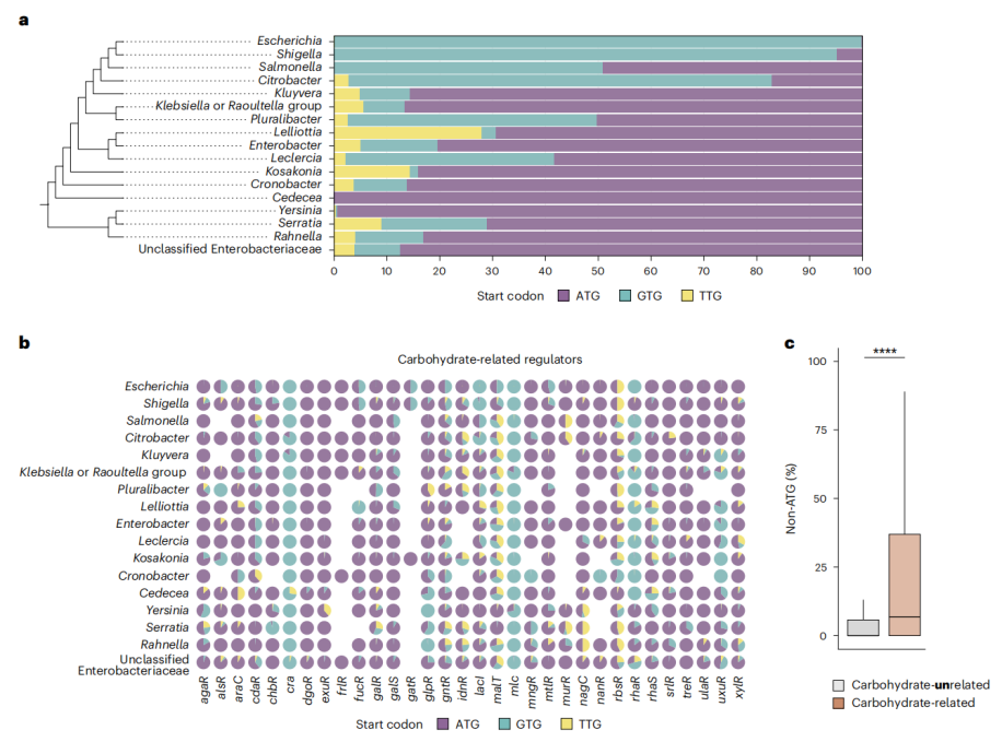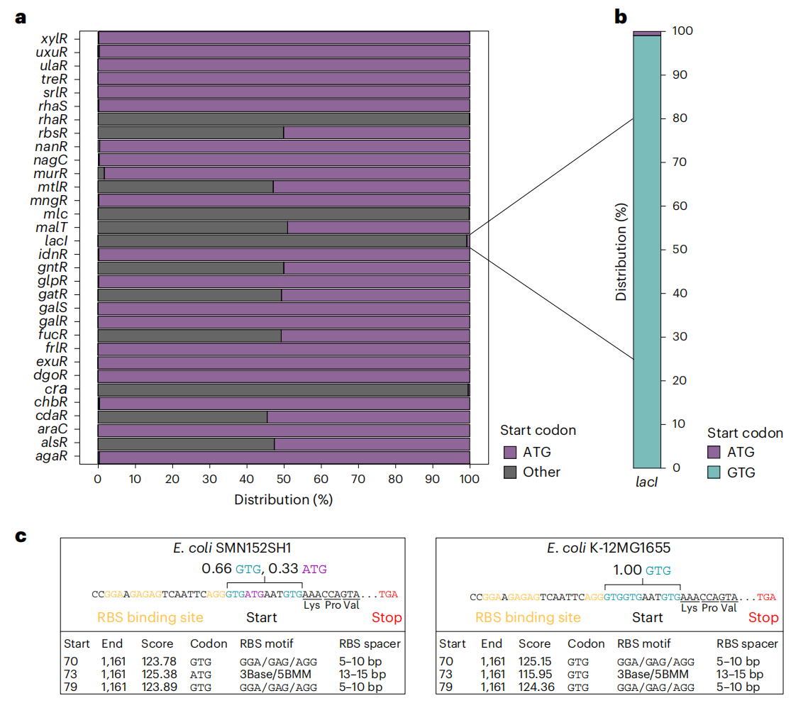 研究人員分析了 10643 個大腸桿菌基因組,發(fā)現(xiàn) 32 個碳水化合物代謝調(diào)節(jié)基因中,有 13 個基因具有非標準起始密碼子,例如 GTG 或 TTG。其中,lacI 基因幾乎全部包含非標準起始密碼子,而 rbsR、murR、mltR、malT、gntR、gatR、fucR、araC 和 alsR 等基因則同時存在 ATG 和非標準起始密碼子。這種現(xiàn)象表明非標準起始密碼子在碳水化合物代謝調(diào)節(jié)中可能具有重要作用。