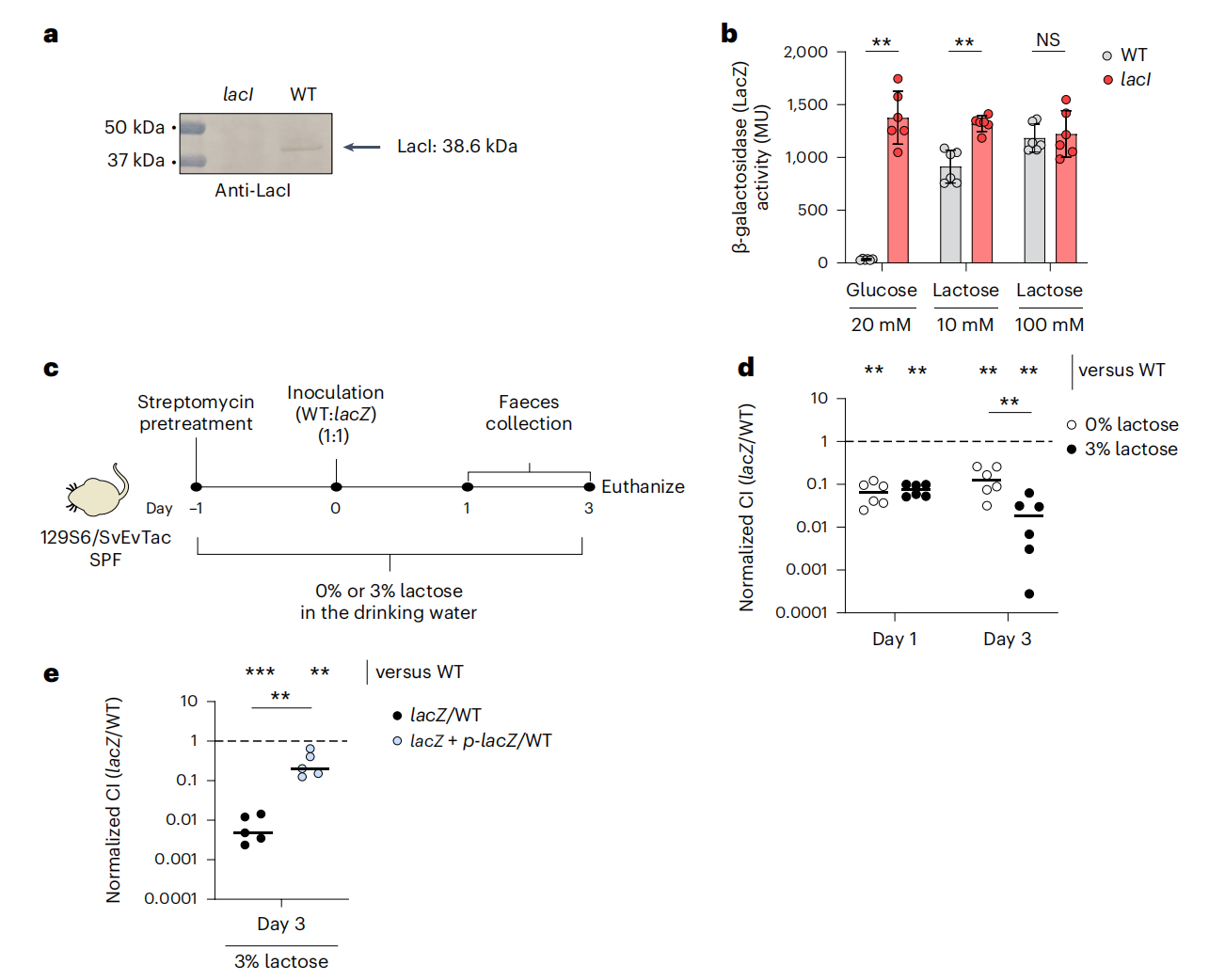 研究人員使用小鼠模型,比較了野生型大腸桿菌 8178 菌株和 lacZ 突變體菌株在富含乳糖條件下的生長情況。結(jié)果顯示,野生型菌株的生長速度更快,這表明 lacZYA 操縱子在腸道定植中起著重要作用。lacZYA 操縱子負責乳糖的代謝,野生型菌株能夠更有效地利用乳糖,從而獲得競爭優(yōu)勢。