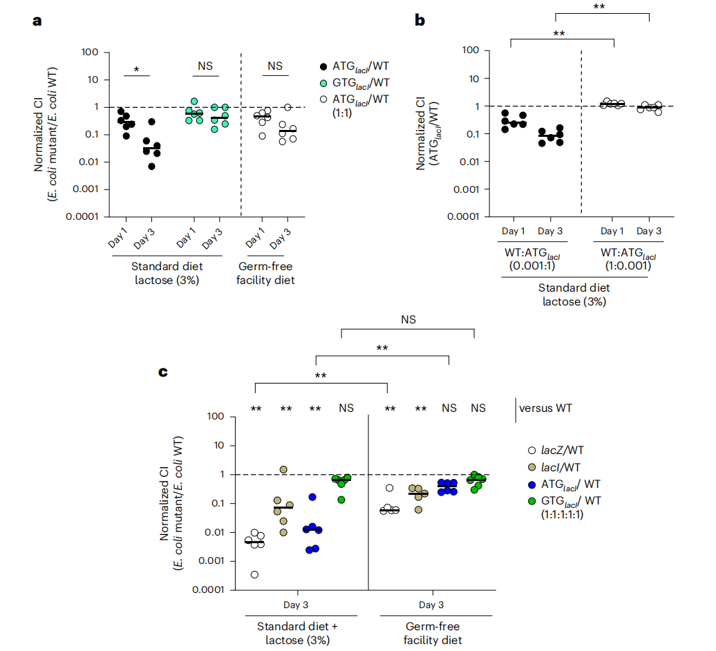 研究人員在不同的小鼠模型和飲食條件下,比較了 lacZ 突變體菌株的適應(yīng)性。結(jié)果顯示,在不同條件下,lacZ 突變體菌株的適應(yīng)性表現(xiàn)出差異,這表明 lacI GTG 起始密碼子的優(yōu)勢是上下依賴性的。例如,在無菌小鼠中,lacZ 突變體菌株的生長劣勢更加明顯,這表明腸道微生物群可能對 lacZYA 操縱子的活性產(chǎn)生影響。此外,不同飲食中乳糖含量的差異也可能影響 lacZ 突變體菌株的適應(yīng)性。