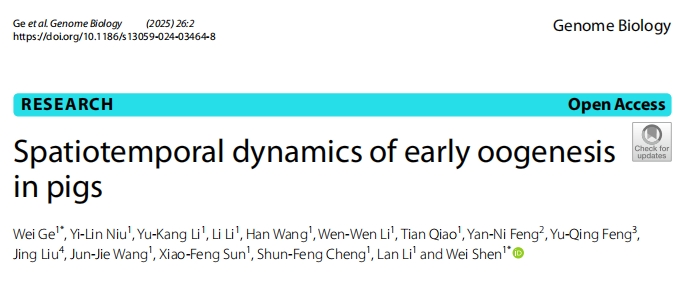 2025年1月,青島農(nóng)業(yè)大學(xué)葛偉教授與沈偉教授團(tuán)隊在學(xué)術(shù)期刊《Genome Biology》上發(fā)表了一篇題為《Spatiotemporal dynamics of early oogenesis in pigs》的研究論文。該研究利用了單細(xì)胞RNA測序和空間轉(zhuǎn)錄組技術(shù),解析了豬早期卵子發(fā)生中的基因表達(dá)及空間組織特征。研究發(fā)現(xiàn),豬生殖細(xì)胞在卵巢中呈“皮質(zhì)到髓質(zhì)”分布,且與人類卵子發(fā)生過程相似,表明豬是研究人類卵子發(fā)生的良好模型。RNA速度分析揭示了顆粒細(xì)胞譜系特征,空間共定位分析和細(xì)胞通訊分析顯示皮質(zhì)與髓質(zhì)區(qū)域生殖細(xì)胞與體細(xì)胞通訊模式不同,特別是NOTCH信號通路和ECM蛋白在調(diào)控中起關(guān)鍵作用,強(qiáng)調(diào)了卵巢微環(huán)境對生殖細(xì)胞命運(yùn)的重要性。