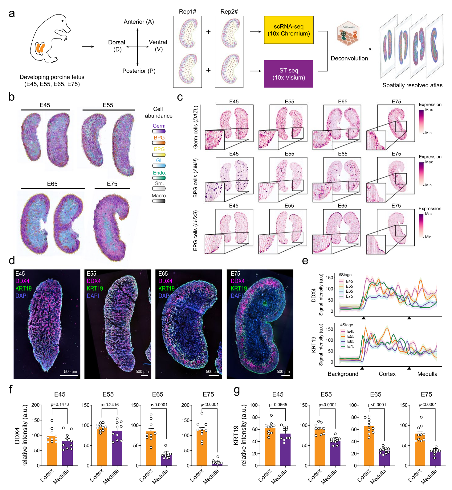 為進(jìn)一步驗證分析結(jié)果,研究者進(jìn)行了全組織染色實驗,使用生殖細(xì)胞標(biāo)志物DDX4和前顆粒細(xì)胞標(biāo)志物KRT19對E45至E75的胎兒卵巢進(jìn)行染色,實驗結(jié)果與ST數(shù)據(jù)分析結(jié)果一致。此外,研究者還分析了這些陽性細(xì)胞在卵巢背腹軸上的空間分布,并通過熒光強(qiáng)度分析確認(rèn)了生殖細(xì)胞和前顆粒細(xì)胞在皮層和髓質(zhì)區(qū)域的不同分布模式。這些發(fā)現(xiàn)為深入理解豬卵巢發(fā)育過程中細(xì)胞類型的空間動態(tài)變化提供了重要線索。