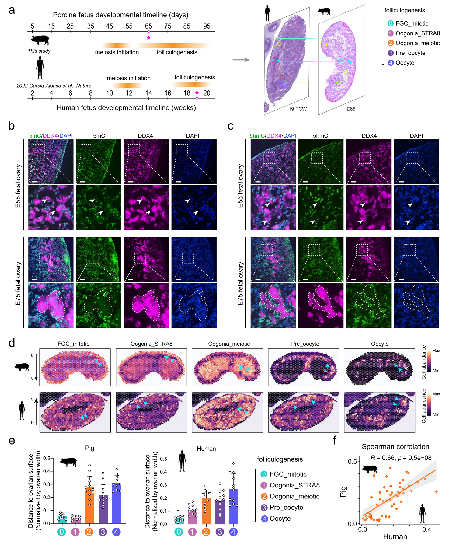 為了深入理解哺乳動物卵母細(xì)胞生成的空間調(diào)控機(jī)制,研究人員進(jìn)行了跨物種分析。研究團(tuán)隊首先獲取了妊娠后19周人類卵巢的空間轉(zhuǎn)錄組(ST)數(shù)據(jù),并將其與豬E65時期的ST數(shù)據(jù)進(jìn)行了比較,以分析卵母細(xì)胞生成各階段生殖細(xì)胞的空間位置模式。與人類情況一致的是,生殖細(xì)胞標(biāo)記DDX4與5mC和5hmC的共染色顯示,在E55和E75豬卵巢中,5mC和5hmC信號在DDX4陽性細(xì)胞中不可檢測,且主要在周圍性腺體細(xì)胞中表達(dá)。這些結(jié)果進(jìn)一步揭示,除了保守的基因表達(dá)程序外,人類和豬在早期卵母細(xì)胞生成過程中的表觀遺傳重編程模式也是保守的。