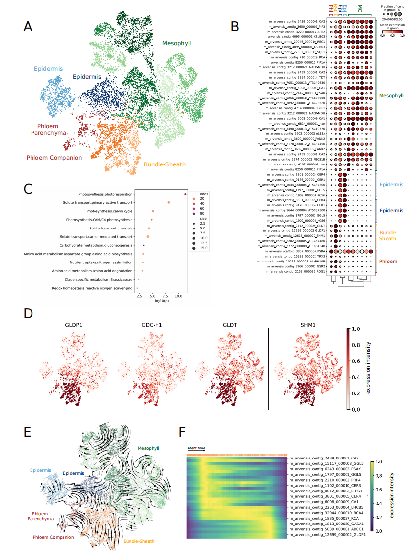 ② 該研究利用最近在單細(xì)胞轉(zhuǎn)錄組測序方面的進(jìn)展,更好地理解新的細(xì)胞特化如何影響相互關(guān)聯(lián)的途徑。研究人員為具有C3-C4中間特征的堇娘芥(Moricandia arvensis)生成了單細(xì)胞核RNA測序數(shù)據(jù)集,并將其與公開可用的C3擬南芥(Arabidopsis thaliana)葉組織的單細(xì)胞轉(zhuǎn)錄組進(jìn)行了比較,還通過免疫金標(biāo)記技術(shù)結(jié)合電子顯微鏡獨(dú)立驗(yàn)證了選定光呼吸蛋白的定位。