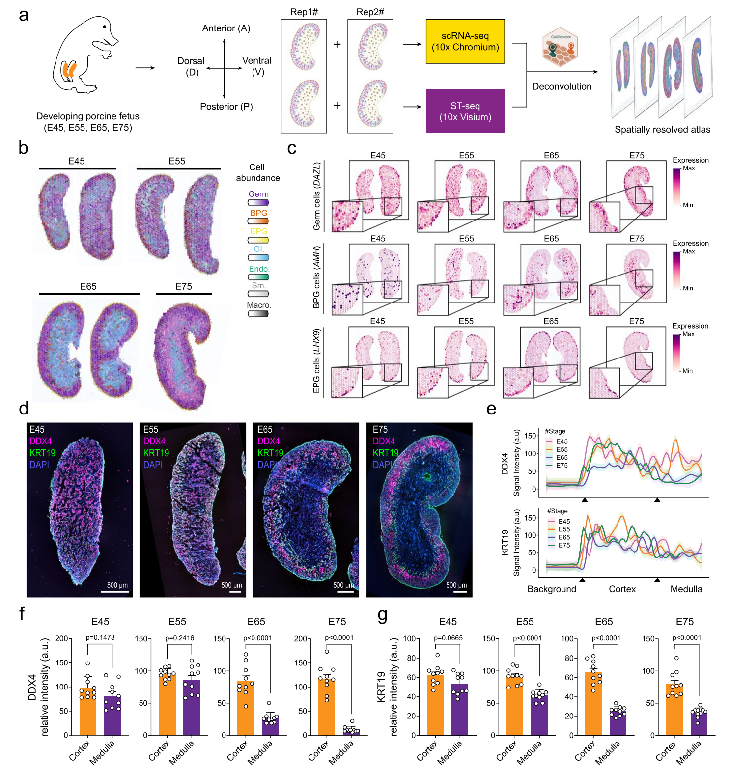 空間轉(zhuǎn)錄組,豬E45、E55、E65、E75胚胎卵巢,10x Visium;E65胚胎卵巢,BMKMANU S1000。