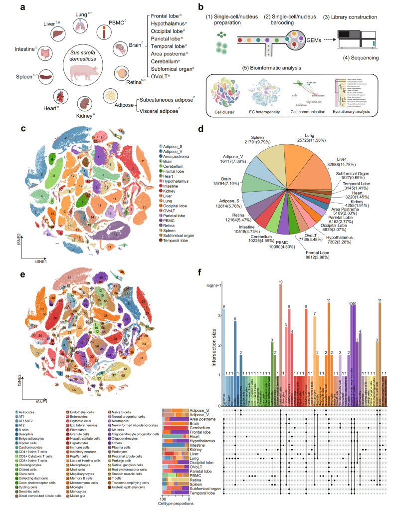 ① 使用單細(xì)胞轉(zhuǎn)錄組測(cè)序及單細(xì)胞核轉(zhuǎn)錄組測(cè)序,構(gòu)建首個(gè)家豬多器官單細(xì)胞圖譜,得到234種降維聚類簇,鑒定出58種細(xì)胞類型及其相關(guān)的顯著富集標(biāo)志基因,搭建了可視化家豬單細(xì)胞轉(zhuǎn)錄組數(shù)據(jù)庫(kù)(Pig Single Cell Atlas Database)。