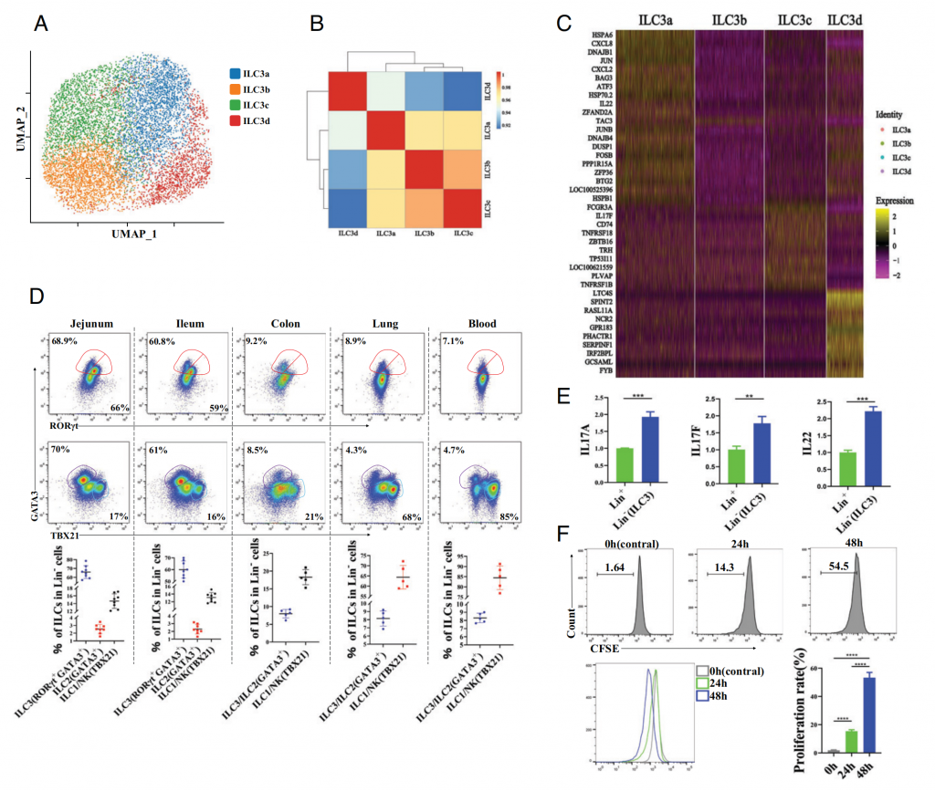 ① 單細(xì)胞數(shù)據(jù)分析顯示,豬腸道ILC(先天淋巴樣細(xì)胞)主要包括ILC3、ILC1、ILC2以及NC細(xì)胞,其中ILC3是豬空腸LPL(固有層淋巴細(xì)胞)中主要的ILC,進(jìn)一步分析揭示ILC3有4種亞群,但沒(méi)有在豬ILC中發(fā)現(xiàn)LTi(淋巴組織誘導(dǎo)細(xì)胞)。
