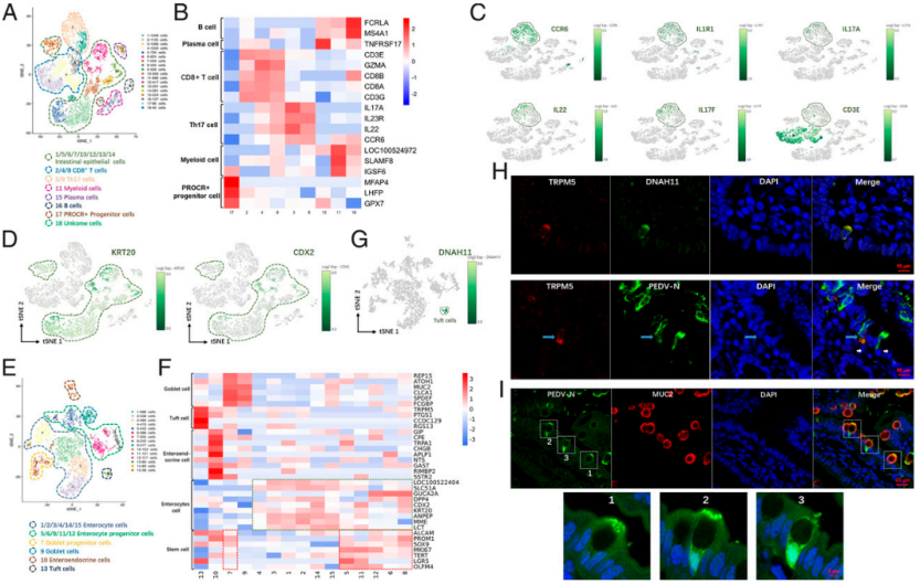 ① 首次繪制感染PEDV(豬流行性腹瀉病毒)的仔豬小腸單細(xì)胞圖譜,使用人小腸細(xì)胞類型marker鑒定出12種細(xì)胞類型,發(fā)現(xiàn)豬小腸tuft細(xì)胞新特異性標(biāo)志基因DNAH11,結(jié)果表明多數(shù)人小腸特異性marker也可以用到豬研究中。此外,豬小腸Th17細(xì)胞(3和9簇)特異性高表達(dá)IL17A、IL7F和IL22,但不高表達(dá)T細(xì)胞代表性CD3,這可能與豬T細(xì)胞分化有關(guān)。