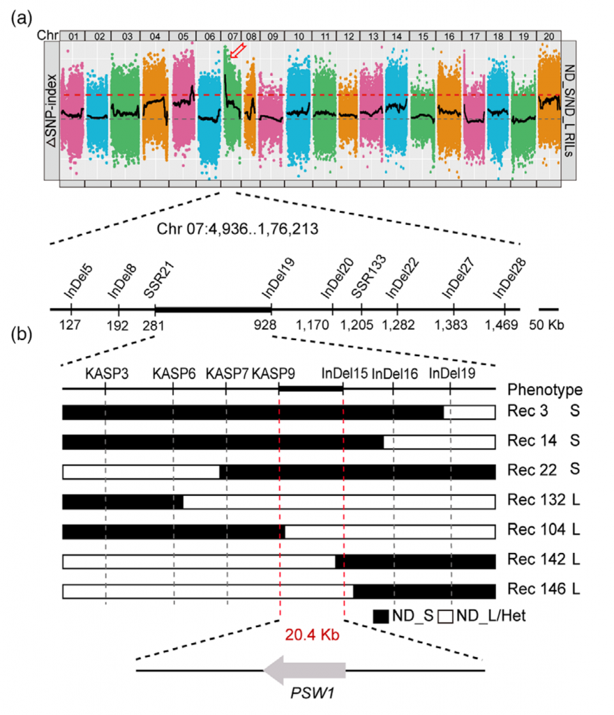 花生莢果大小是決定花生產(chǎn)量的關(guān)鍵農(nóng)藝性狀,為了鑒定控制花生莢果大小的基因,該研究對188份核心種質(zhì)進行鑒定,并選取莢果大小/重量差異顯著的2份花生材料構(gòu)建F2群體,BSA-Seq獲得了288.58 Gb的原始數(shù)據(jù)。利用285914個高質(zhì)量SNPs 和70 759個 InDel,將控制莢果大小的基因定位在07染色體1.17 Mb的區(qū)間內(nèi)。作者從F6:7和F6:8群體中開發(fā)了15個多態(tài)性標(biāo)記并對個體進行基因分型,精細定位QTL到KASP 9 和In Del15之間20.4 kb的區(qū)間內(nèi)。該區(qū)間僅包含1個預(yù)測的非同義突變基因和InDels,將該基因命名為PSW1