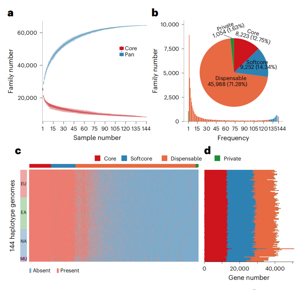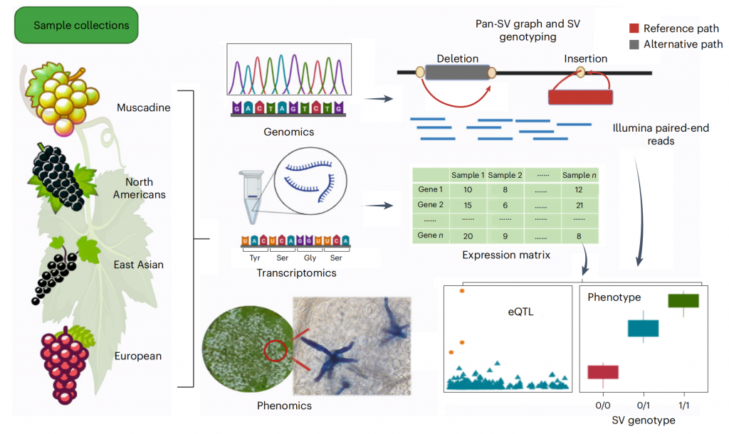 葡萄作為最古老的馴化作物之一(約公元前11,000年),漫長的持續(xù)馴化和多年的育種改良導致現(xiàn)代葡萄品種的遺傳多樣性縮小和抗性丟失,使其易受病蟲、逆境等各種不利條件的影響。近年北美葡萄泛基因組(Genome biology, 2023),歐洲葡萄泛基因組(Nature Genetics, 2024)的相繼報道,野生葡萄以其豐富的遺傳多樣性和超強的抗性基因再次受到關注,但以大群體染色體級基因組組裝為基礎,涵蓋主要品種,特別是包含東亞野生種葡萄的屬級泛基因組一直未見報道。因此構建涵蓋整個葡萄屬的泛基因組將成為了解葡萄遺傳多樣性、開展功能基因組學研究、識別隱性遺傳特性以及葡萄精準改良的關鍵資源。