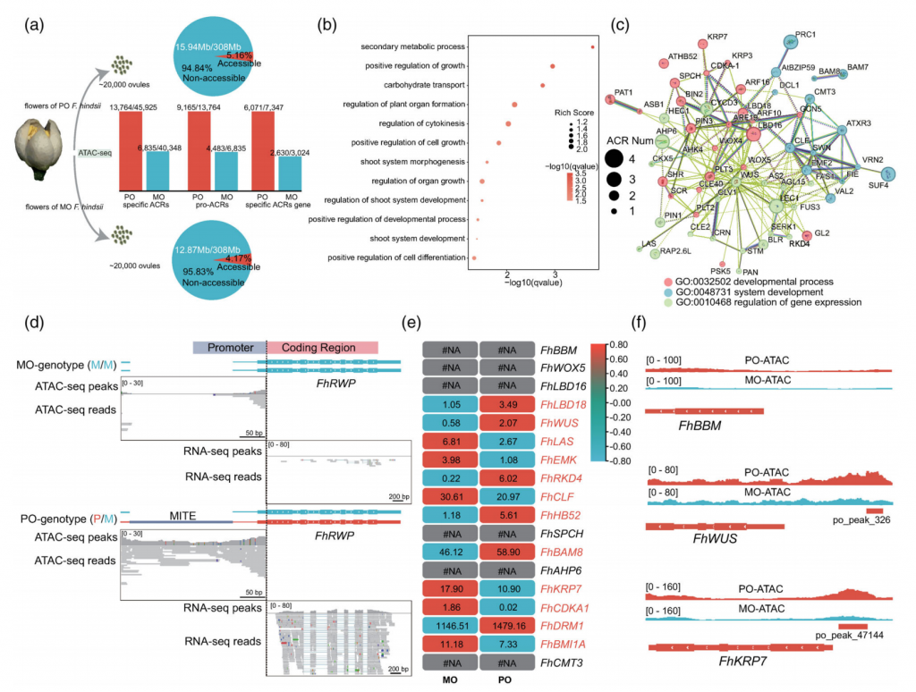 先前的研究表明,一個顯性基因FhRWP決定了與微型倒重復(fù)轉(zhuǎn)座因子(MITE)插入相關(guān)的不定胚胎的啟動,在PO基因型中FhRWP的啟動子區(qū)中鑒定到了特異性ACR,而Mo基因型中不含ACR,該ACR與FhRWP啟動子區(qū)域的MITE序列重疊,即MITE序列被FhARID1蛋白結(jié)合,這可能是染色質(zhì)重塑復(fù)合體的一個亞基,這些結(jié)果表明,F(xiàn)hRWP是可及染色質(zhì)的決定因素,參與不定胚胎發(fā)育,與MITE的插入有關(guān)。