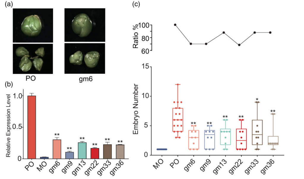 FhRWP基因在胚囊中的表達是特異性和短暫的,可以從受精前7天開始追蹤,直到后10天,作者采用RNAi方法構(gòu)建了6個干擾系,發(fā)現(xiàn)FhRWP在6個干擾系中的表達量相比PO系顯著降低,但顯著高于Mo基因型,且FhRWP表達量降低后不定胚數(shù)量也都減少了,這些結(jié)果提示,受FhRWP控制的不定胚表型可能與基因表達的劑量效應(yīng)有關(guān)。