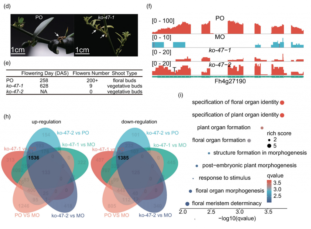 作者之前的研究顯示的雜合子插入MITE啟動子區(qū)域和一個FhRWP的CDS序列區(qū)域SNP(C-G),導(dǎo)致這個基因的分裂成兩個單倍型,M等位基因(MITE)和P等位基因(沒有MITE)。根據(jù)Mo和PO腋芽的轉(zhuǎn)錄組結(jié)果,作者發(fā)現(xiàn)PO中RWP轉(zhuǎn)錄本高表達P等位基因,而Mo中M等位基因表達較小,于是作者構(gòu)建了CRISPR/Cas9載體,以敲除FhRWP,結(jié)果表明,插入MITE可以通過促進含有MITE的P等位基因的表達,同時減少不插入MITE的M等位基因的表達,從而改變該基因的表達模式。雖然FhRWP在ko-47-1和ko-47-2中的FhRWP的表達下降到與Mo一致的水平,但P等位基因突變導(dǎo)致的過早終止導(dǎo)致了FhRWP功能的喪失,因此,ko-47-1和ko-47-2植株表現(xiàn)出新的表型,如生長遲緩和花芽分化失敗。