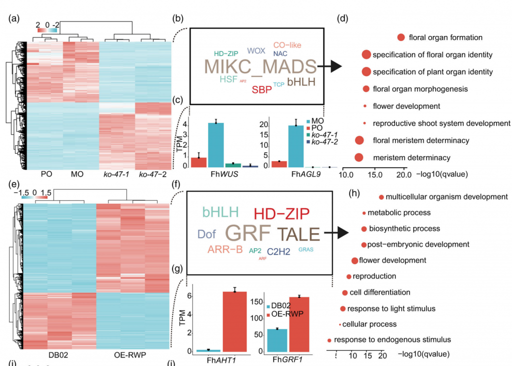 多項實驗結(jié)果表明,F(xiàn)hRWP在協(xié)調(diào)細胞命運和啟動植物再生和繁殖過程中起著關(guān)鍵作用,因此,該研究對腋芽MO/PO胚珠的表達數(shù)據(jù)進行了整合的轉(zhuǎn)錄組分析。差異基因在花器官發(fā)生和繁殖相關(guān)的生物過程顯著富集,其中來自MADS和WOX等基因家族的轉(zhuǎn)錄因子,包括FhWUS和FhAGL6,均顯著富集,在過表達的愈傷組織中,共鑒定出354個差異表達的轉(zhuǎn)錄因子,GO注釋顯示與胚胎后發(fā)育和再生相關(guān)的過程顯著相關(guān)。值得注意的是,屬于GRF和TALE等基因家族的轉(zhuǎn)錄因子,包括FhAHT1和FhGRF1,表現(xiàn)出顯著的富集,這些基因已被廣泛報道參與光形態(tài)建成、葉片發(fā)育等信號通路。