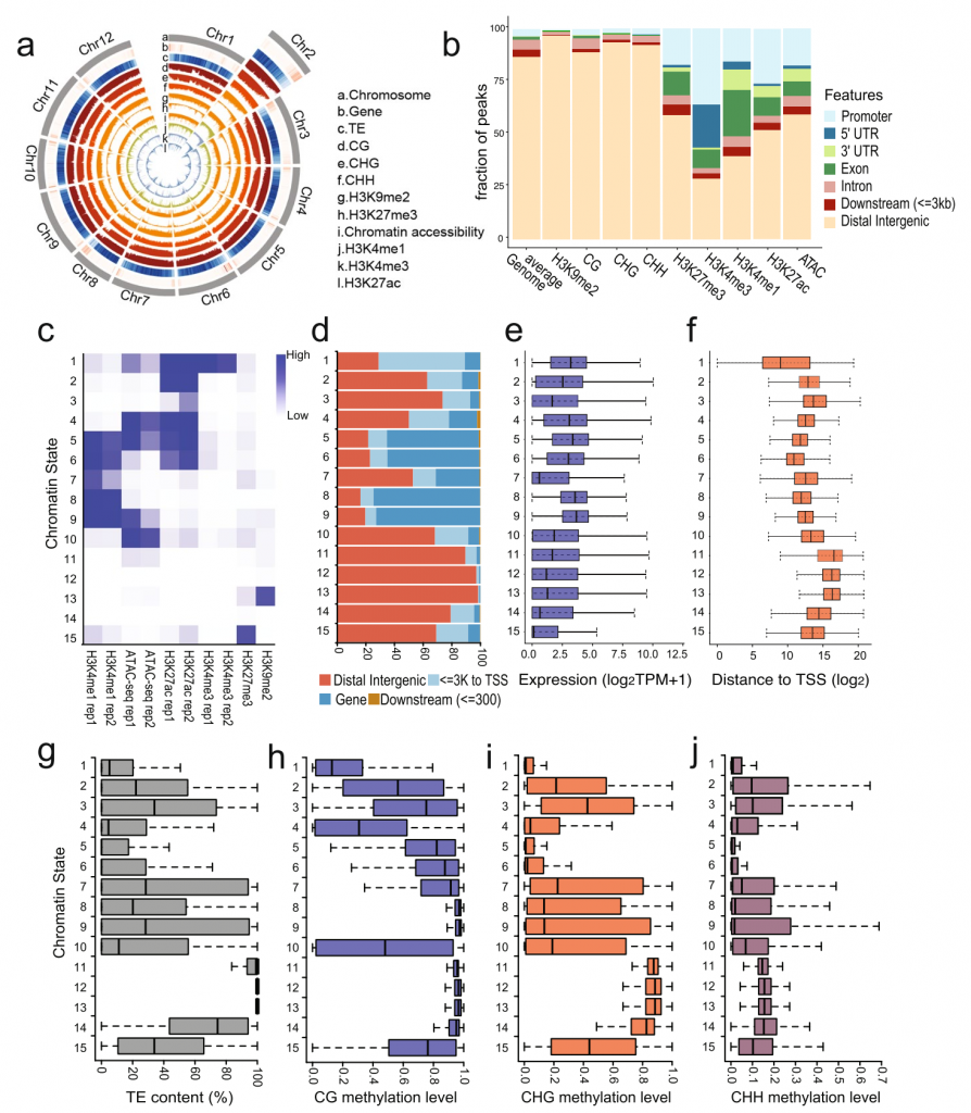 該研究以樟樹港辣椒為模型,系統(tǒng)揭示了辣椒在全基因組范圍內(nèi)的表觀特征,并在此基礎(chǔ)上推測包括啟動子和增強(qiáng)子在內(nèi)的瞬時(shí)調(diào)控元件。研究發(fā)現(xiàn),辣椒啟動子主要由H3K4me3,?H3K27ac和開放染色質(zhì)共同修飾,而增強(qiáng)子的特征為開放染色質(zhì)。在此基礎(chǔ)上,該研究對生長發(fā)育以及脅迫響應(yīng)的調(diào)控元件進(jìn)行了挖掘,并對部分元件進(jìn)行實(shí)驗(yàn)驗(yàn)證。此外,該研究報(bào)道了辣椒基因組基因間區(qū)H3K4me1和H3K27me3共同修飾的區(qū)域,推測為暫時(shí)未表達(dá)(poised)的調(diào)控元件,其具體分子功能有待驗(yàn)證。